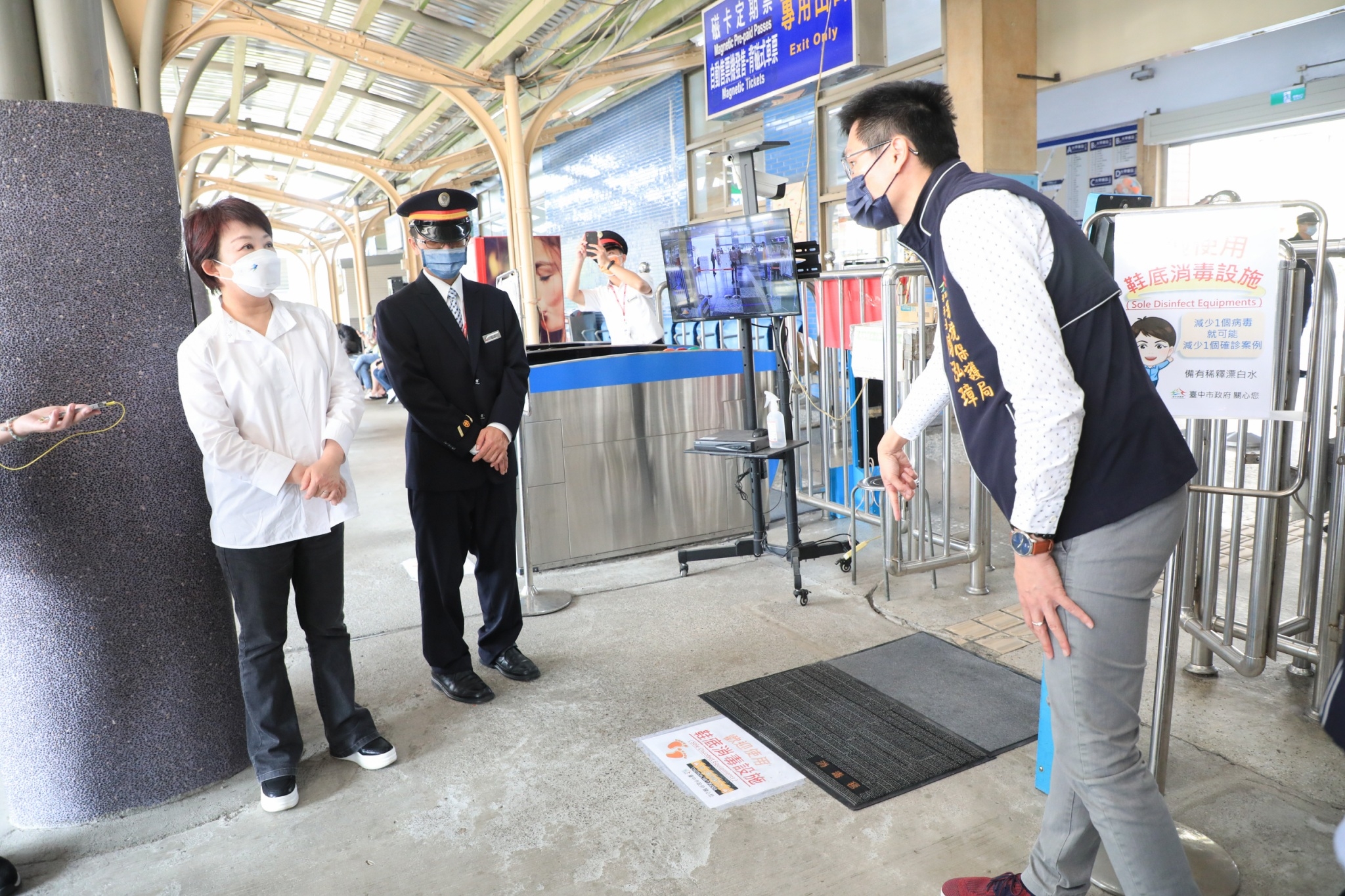 盧市長強調,今日實地視察大甲火車站設置的鞋底消毒毯,搭配5055簡易消毒水,讓參加遶境活動的信眾及旅客除了消毒鞋底,還可同時消毒行李箱、手推車及輪椅的輪胎,降低病毒沾附鞋底、輪底的傳播機會。