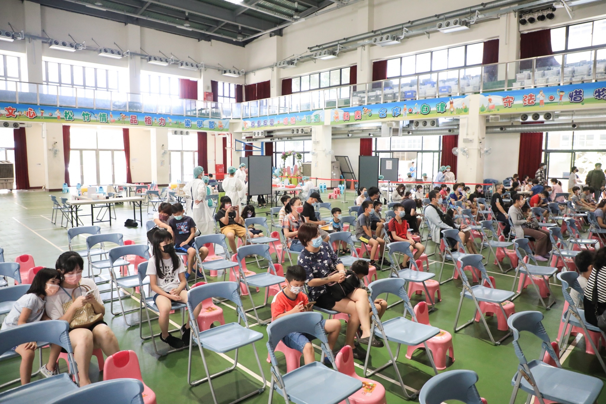 「防疫不休息!」盧市長說,611歲學童疫苗第二劑接種調整為兩劑間隔48週,台中之前施打莫德納疫苗的小朋友已可接種第二劑,市府與學校合作利用週末家長比較有時間的時候,在全市開設26個兒童疫苗快打站,現場有冷氣、播放卡通及工作人員提供服務。