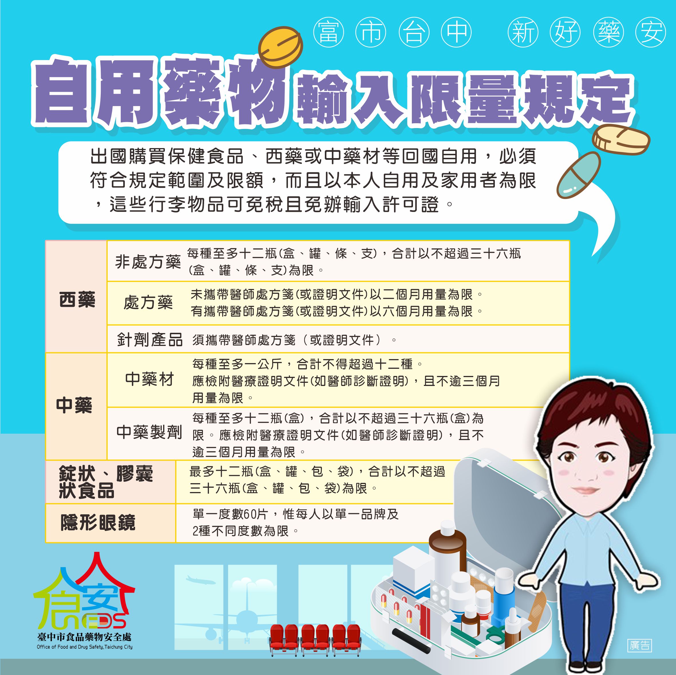 民眾出國旅遊採購藥物或化粧品,若超過攜帶自用藥物回台的限量規定,恐違規受罰或被沒入銷毀。對此,台中市食品藥物安全處提醒民眾遵守「入境旅客攜帶自用藥品限量」規定,其中藥粧店常見非處方藥,如頭痛藥、感冒藥等,每種至多12瓶(盒、罐、條、支),合計以不超過36瓶為限,呼籲民眾注意,以免受罰。