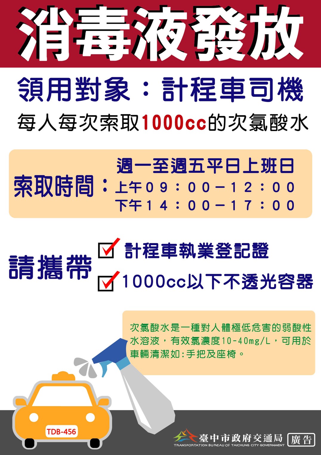 台中市政府全力落實計程車防疫,除向中央爭取計程車駕駛足額口罩,日前提供兩處消毒點協助計程車業者進行車輛消毒,今(19)起免費提供全市合法登記的計程車次氯酸水消毒液,計程車駕駛可於每週一至週五上午9時至12時、下午14時至17時,攜帶執業登記證並自備1,000cc以下不透光容器至交通局1樓停車場後側(西區民權路101號)裝取,該計畫後續將視疫情狀況滾動調整。