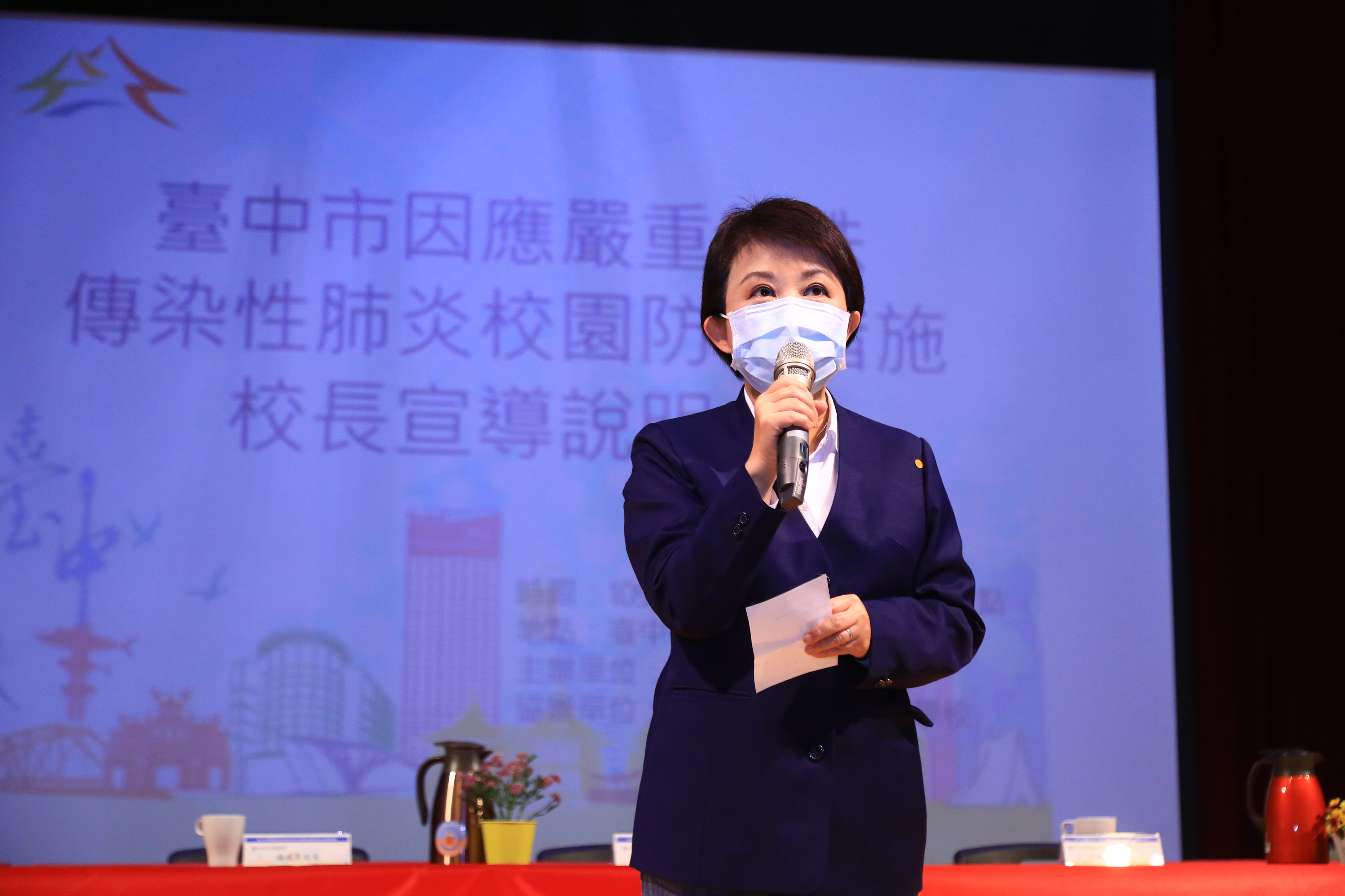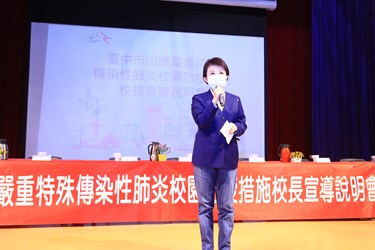全國高中以下學校下周開學,台中市政府教育局今(20)日在惠文高中召開高中以下學校校園防疫措施校長宣導說明會,市長盧秀燕親自出席,除宣布「取消開學典禮」、「量測體溫」、「校園消毒」外,更透露台中已獲善心人士捐贈口罩,將於開學後加碼每位國小以下的學童,每人分送2片口罩;她也強調開學前,不論口罩、消毒水、額溫槍等防疫物資,皆會做準備,讓師生與家長安心。