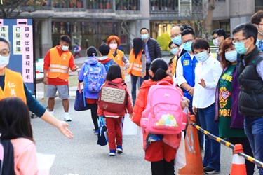 盧市長今日在教育局長楊振昇、仁美國小校長張永雄陪同下,親自視察仁美國小開學日校園防疫情形,市議員黃健豪也到場關心。(2/25*7)*教育局