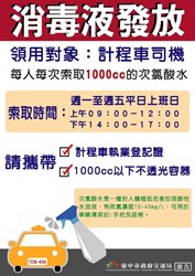 此外,為讓民眾方便辨識已消毒完成的計程車,交通局已印製專屬告示貼紙,提供計程車駕駛索取張貼,讓民眾安心搭車;另外,市府也已針對業者展開消毒用酒精需求調查,後續將向中央提出相關建議,加強消毒酒精配售。