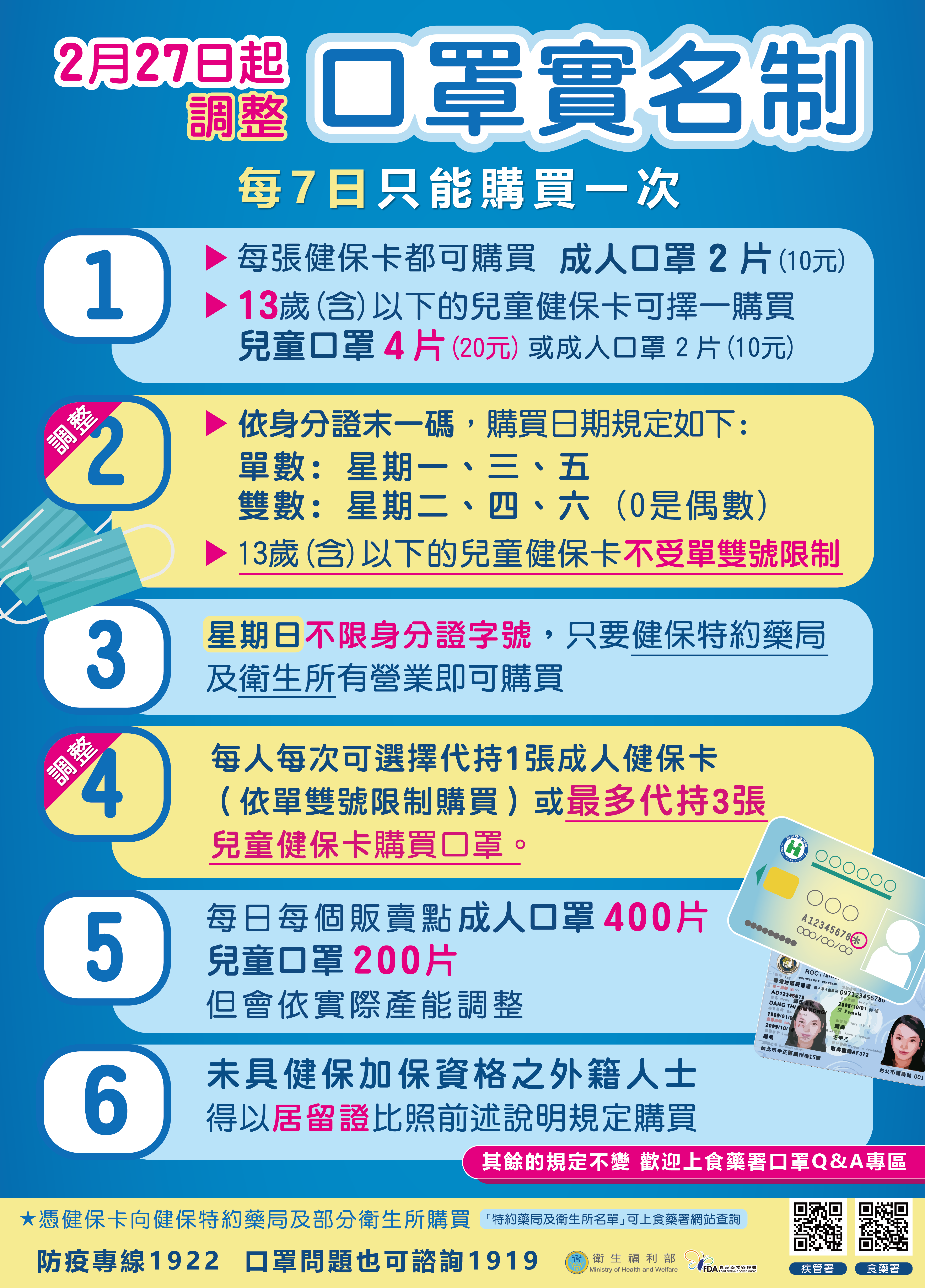 此外,現行中市衛生所販售實名制口罩的片數及購買間隔規定與中央相同,成人健保卡依身分證字號末碼雙號者可在每週二、四、六購買,單號者則是在每週一、三、五購買,週日則不限定身分證字號末碼單雙號都可購買;13歲(含)以下兒童健保卡則不受尾碼號限制,每張卡可買2片成人口罩或4片兒童口罩,7天內只能購買1次,每人每次最多可代持3張兒童健保卡購買。
