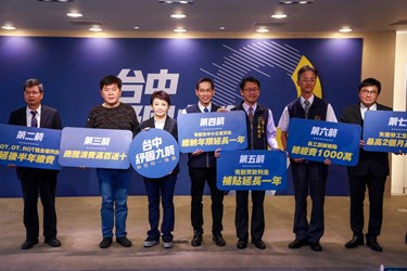 第九箭則是全國首創「資金紓困協調辦公室」,電話:04-22289111分機31139、31141、31142、31143;針對台中市自然人,公司,商號因疫情影響,需新增貸款或申請延繳等,將協調二信、中信銀、台灣企銀、台灣銀行、台中商業銀行協助,歡迎民眾使用。