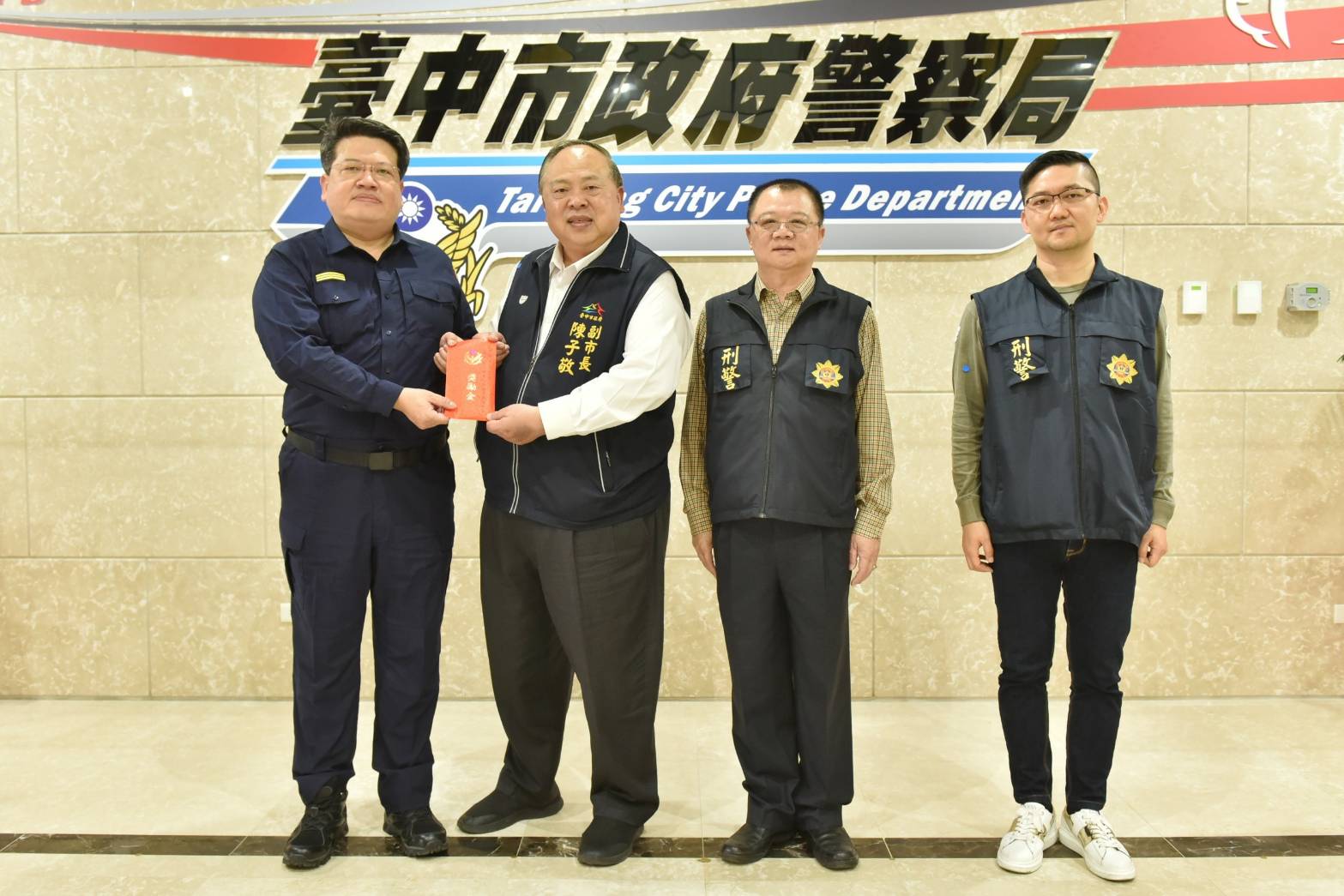 台中市警局第三、第五、豐原分局及刑事警察大隊日前在南投縣草屯鎮某汽車旅館破獲擁槍自重、在台中犯下多起槍砲及傷害案件的暴力集團。為激勵員警士氣,副市長陳子敬昨(6)日代表市長盧秀燕頒發有功人員慰勉金,肯定員警打擊犯罪的決心、專業與效率,讓台中治安滿意度逐年提升。