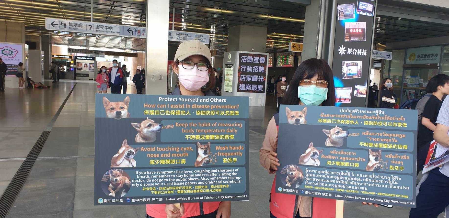 勞工局今日邀集交通局、經濟發展局、建設局、水利局及台鐵台中運務段等機關,在移工來源國雙語人員協助下,帶著印有中越、中印、中泰及中英雙語版本的「保護自己也保護他人,協助防疫可以怎麼做」及「1922防疫專線與1955勞工諮詢申訴專線」手持牌,以移工母國語言標示定期量體溫、減少觸摸眼口鼻、勤洗手等防疫觀念,從台中火車站出發沿路宣導,簡單醒目圖示讓人一目了然。