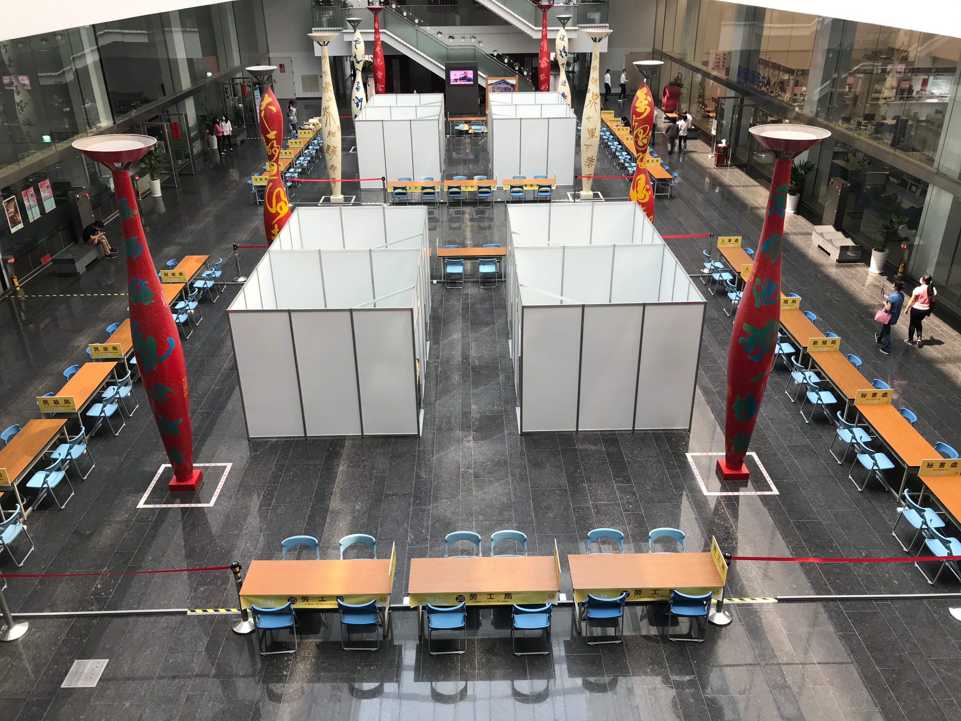 市府秘書處表示,台灣大道及陽明市政大樓原由各機關在1樓聯合服務中心及各機關所在樓層,提供各項諮詢與洽公服務,為因應疫情,整合市政大樓各機關服務機能,於1樓通風較佳的中庭設置聯合洽公專區,集中提供各項服務,可減少人員至2樓以上樓層走動或搭乘電梯機會,降低非必要接觸風險。