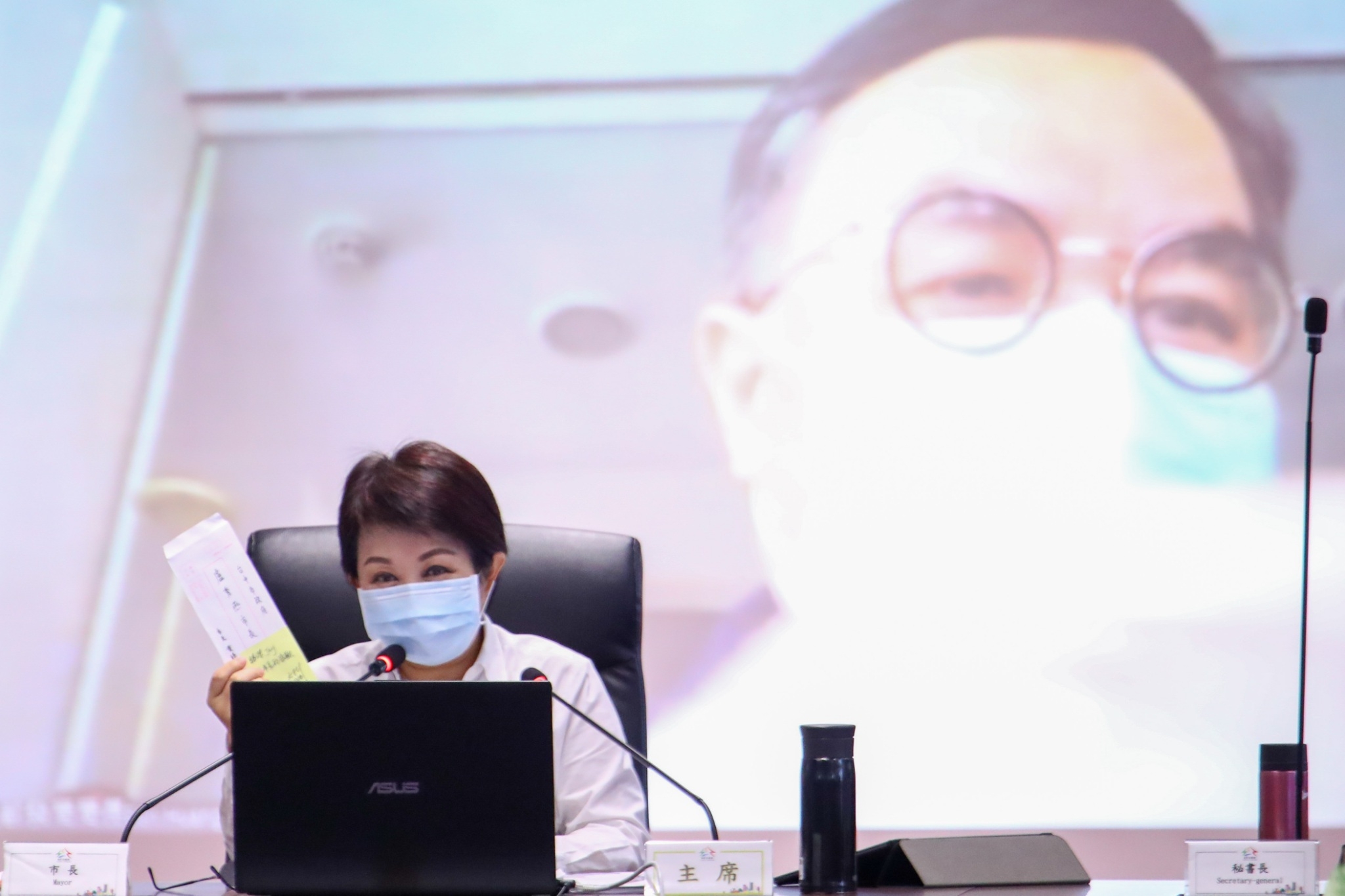 另外,今日是都發局長黃文彬在家辦公最後一天,盧市長在會中也與都發局長黃文彬視訊連線,盧市長拿出黃局長兒子寫的一封感謝信,代替黃局長感謝所有醫護人員與市府同仁的防疫辛勞。