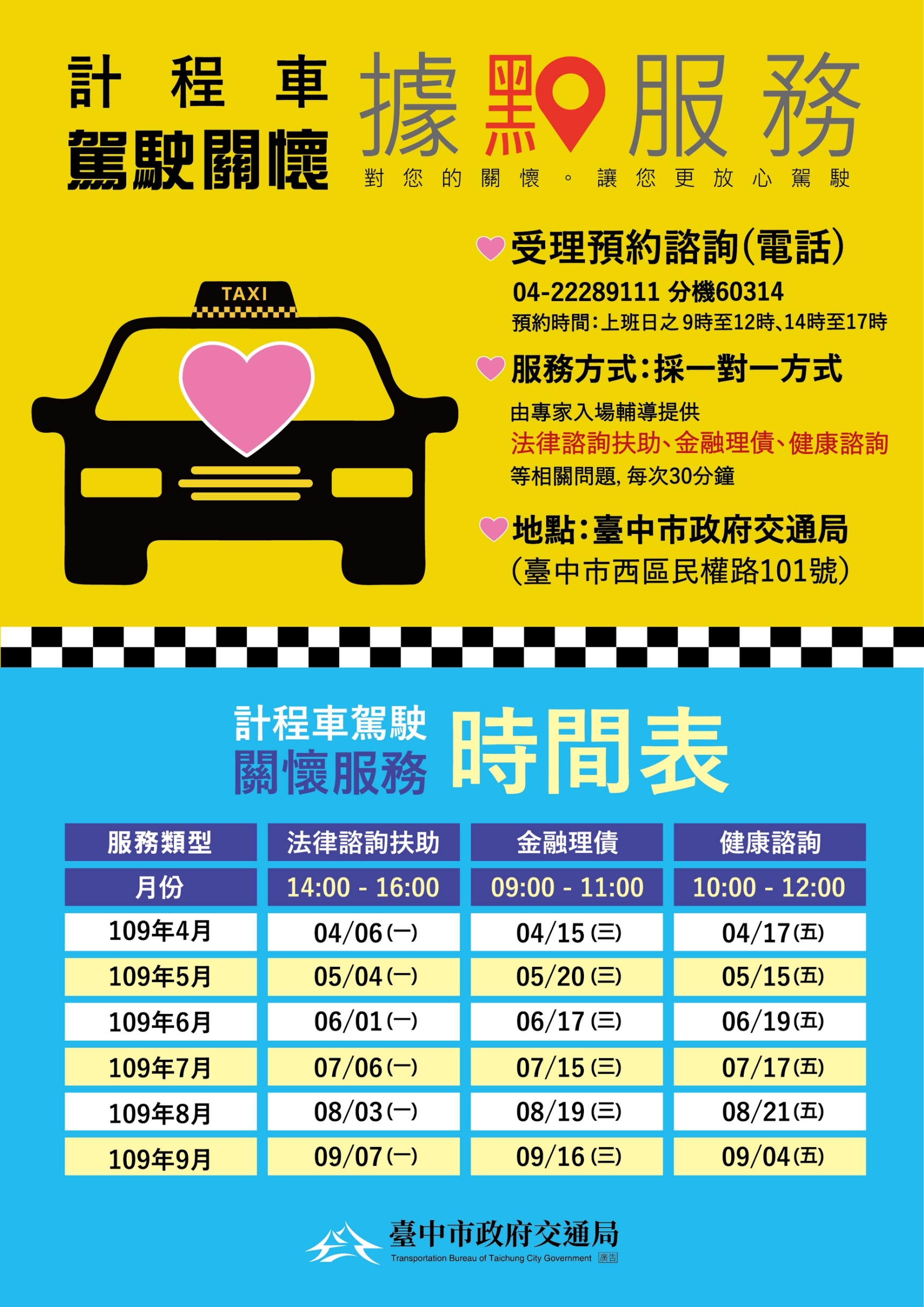 葉局長指出,「計程車駕駛關懷服務據點」每月提供三場免費諮詢,包括第1個星期一下午2時至4時提供法律諮詢扶助;第3個星期三上午9時至11時提供金融理債諮詢;第3個星期五上午10時至12時提供健康諮詢;為兼顧個人隱私,採一對一方式進行,歡迎計程車駕駛電洽交通局運輸管理科(電話:04-22289111分機60314)預約。