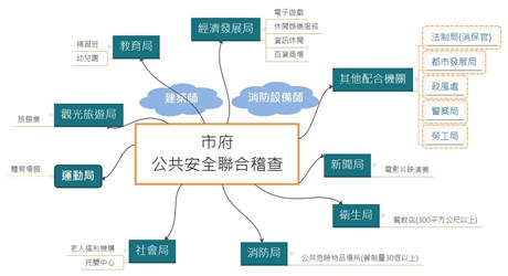 消防局表示,為保障民眾公共安全及落實場所品質管理,市府消防局、勞工局、衛生局、警察局、法制局、教育局、新聞局、運動局、社會局、觀旅局、經發局等機關,定期稽查電子遊戲、休閒娛樂服務業、資訊休閒、補習班、幼兒園、體育(運動)場館、旅宿業、老人福利機構、托嬰中心(含兒少安置機構)、電影片映演業、百貨商場、餐飲店(樓地板面積達300平方公尺以上),以及達管制量30倍以上的公共危險物品場所等公安管理。