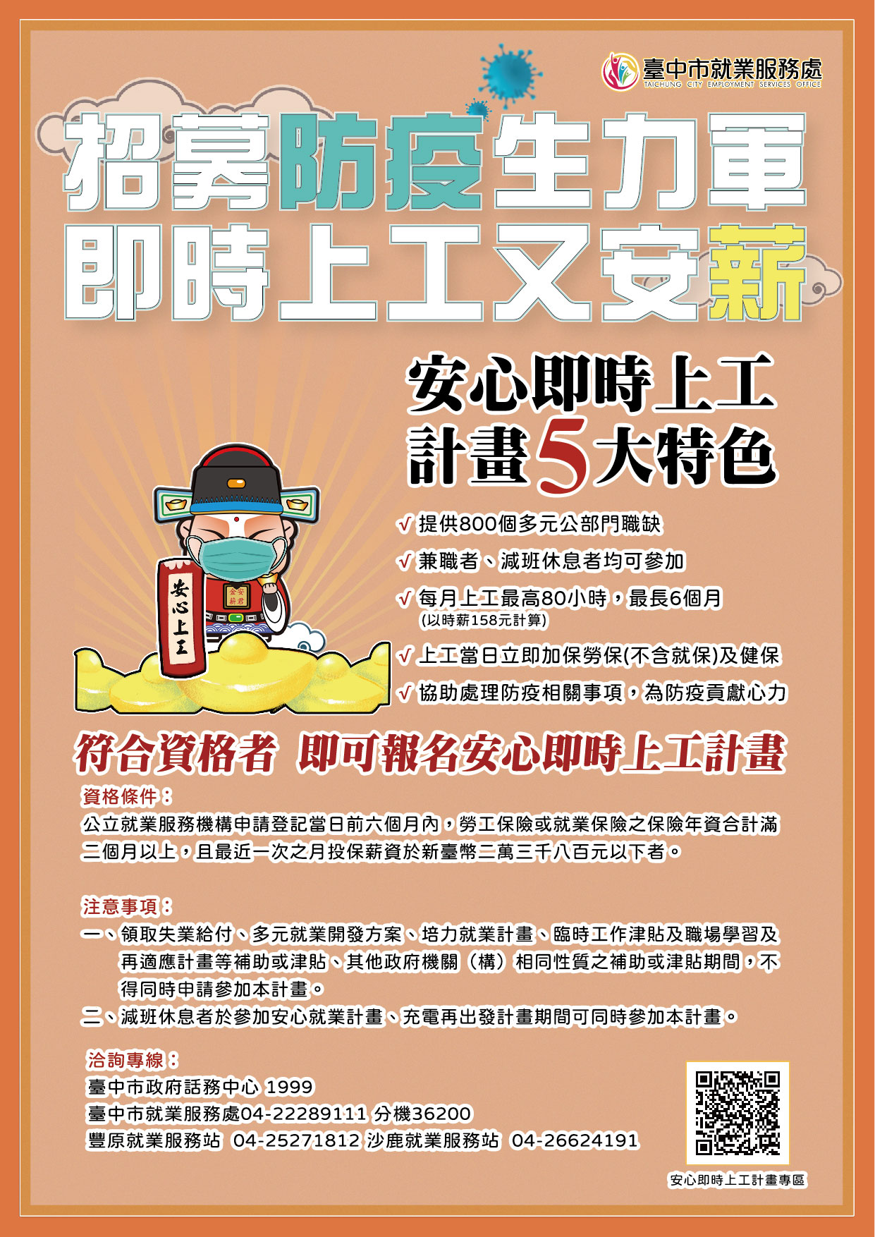 為協助受新冠肺炎影響的打工族或減班休息勞工,台中市政府向勞動部申請經費推動「安心即時上工計畫」,提供800個公部門短期與防疫相關職缺,經用人單位進用後,每人每月最多服務80小時,最高可領1萬2,640元工作津貼,為期6個月,即日起受理登記。歡迎符合最近一次勞保月投保薪資2萬3,800元(含)以下,及申請登記日前6個月勞保或就業保險年資合計滿2個月以上的勞工,前往市府所屬各就業服務站台登記!