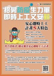 勞工局長吳威志表示,因應肺炎疫情持續延燒,市府升級推動各項防疫工作,包括洽公民眾量測體溫、實名登記、公共環境清潔消毒、防疫物品發放等,皆需撥用大量公務人力執行,透過「安心即時上工計畫」除讓受疫情衝擊致收入減少的打工族或減班休息勞工增加收入,也能減輕市府人力負擔,創造雙贏。