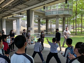 3C形意拳》展間帶領學生觀賞由藝術家用身體動作,模仿3C產品特徵的影像後,至園區戶外草地依形意拳影像一起動起來,希望學生以全新的角度體驗數位科技生活;最後則在戶外進行「紙偶人的創作」工作坊,紙張化成栩栩如生的人偶,激發學生創意及手指靈活度。