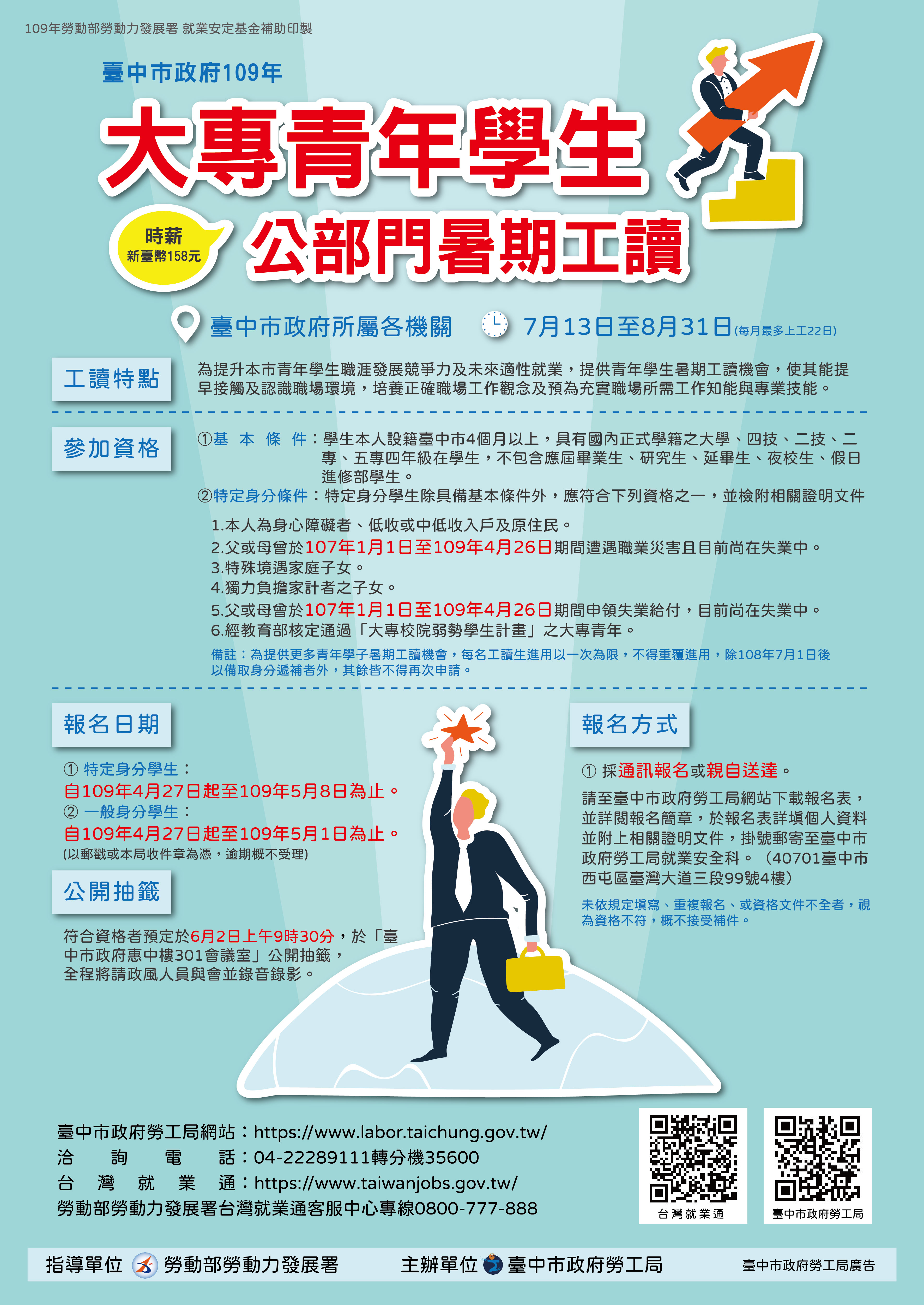 相關報名簡章請至台中市政府勞工局網站(https://www.labor.taichung.gov.tw/1229008/1229015/1247865/1482088/1490751/post)下載,也可至台中市就業服務處所屬站台索取,暑期工讀計畫詳細內容,請電洽勞工局就業安全科04-22289111分機35600。(4/20*7)*勞工局