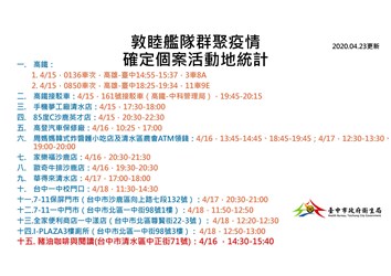 黃局長也呼籲,全民共同的敵人只有一個「就是病毒」,市府會持續透過定位足跡及各項資訊等相關管道持續更新疫調,並及時發布,請大家平心看待確診個案,市府將持續提醒民眾,若曾於所列時段及地點活動,應自主健康管理,外出時請佩戴口罩,若有不適,請撥打1922防疫專線,就醫時主動告知活動暴露史。(4/23*18)*經濟發展局
