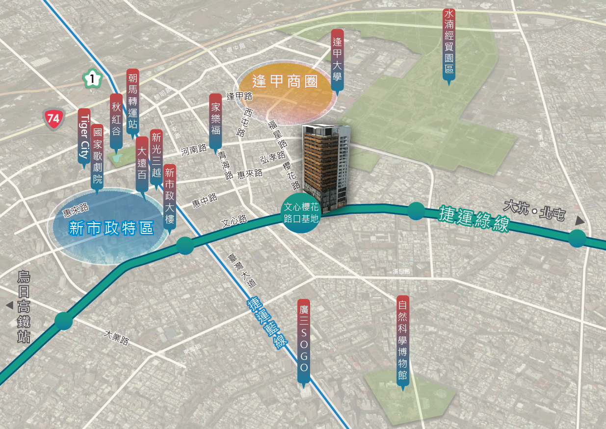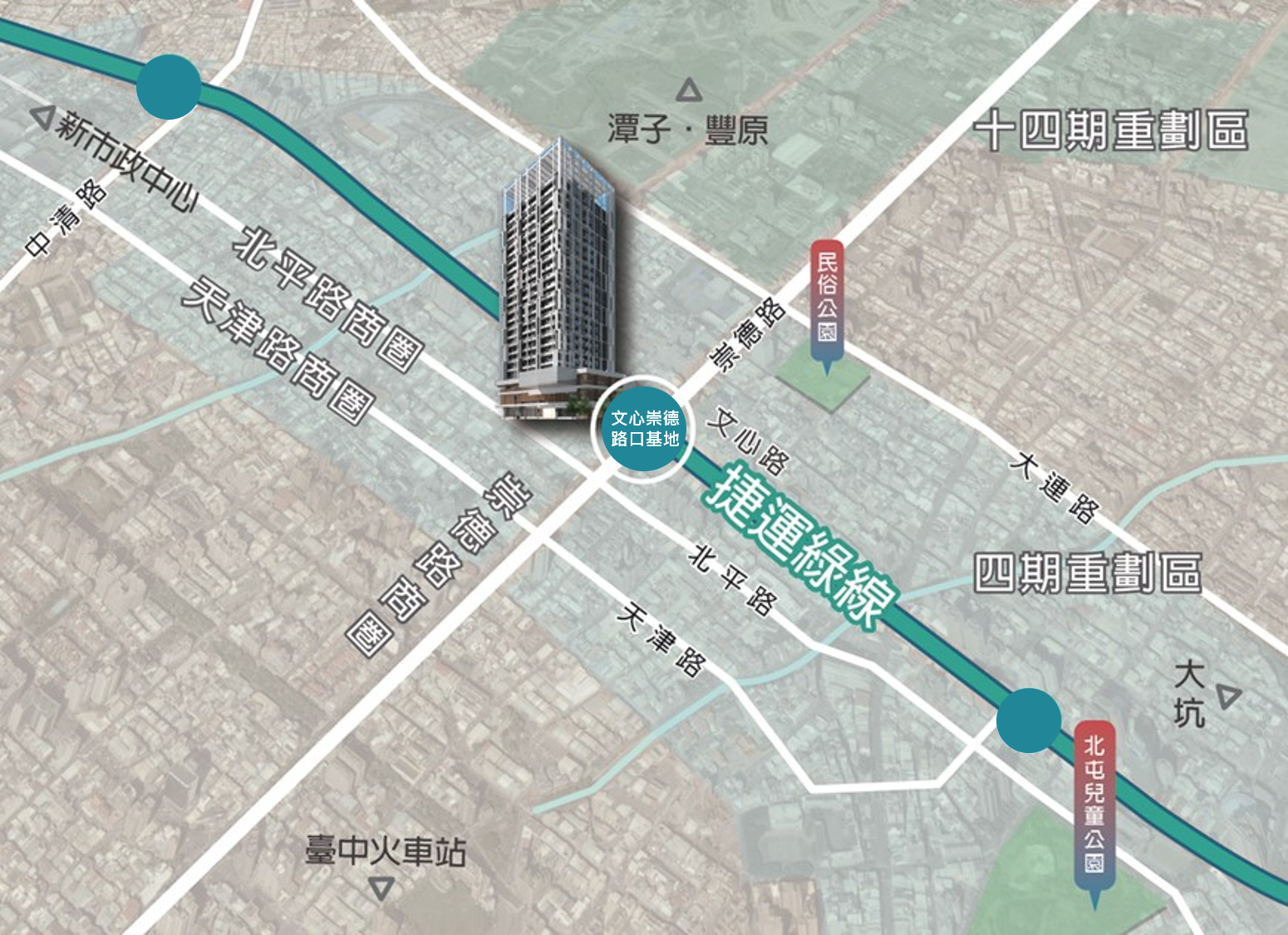 葉局長說明,捷運綠線文心路與崇德路口基地面積700坪,文心路與櫻花路口基地面積500坪,地段條件皆屬台中市首選,基地建蔽率及容積率均為70%及500%,開發項目比照商業區,市府不預設立場,由投資人依市場機制充分發揮,歡迎慧眼獨具的投資人共同參與,打造台中捷運綠線璀璨雙星。