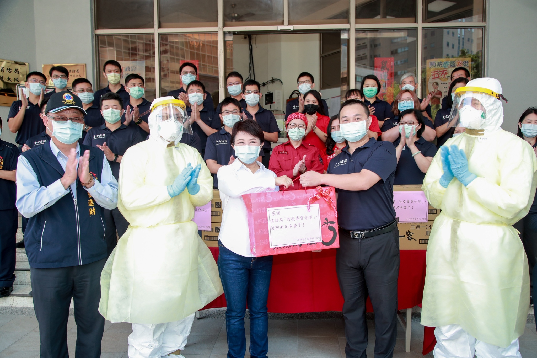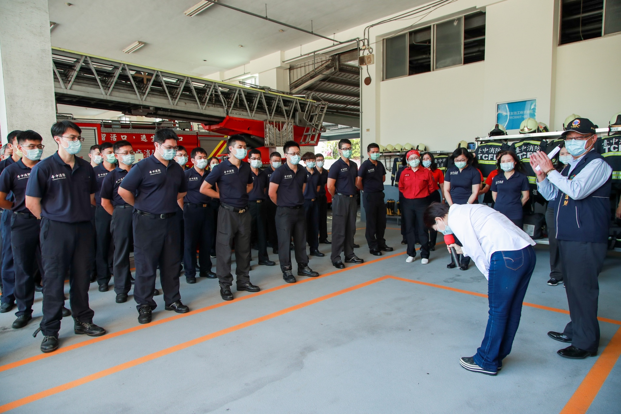 台中市消防人員除受理一般救護案件,今年1月22日起更組成「防疫專責分隊」,專責載送中市疑似新冠肺炎個案,送往收治醫院篩檢治療,截至目前已累計載送329案。市長盧秀燕今(29)日特別前往消防局第七救災救護大隊慰勞同仁,90度鞠躬並握住隊員的手說「各位同仁辛苦了,謝謝!」她強調,救災救護同仁平時做的都是「超人」任務,是守護城市的英雄!