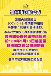 因新冠肺炎疫情趨緩,台中市政府5月18日起洽公回歸至各機關辦公樓層辦理,但物流、外送或郵務人員仍限1樓以下交貨;所有人員入府仍需戴口罩、量測體溫、消毒雙手及保持社交距離,員工進入須配戴識別證,非進駐市政大樓內的員工及洽公民眾,須配合實名登記,並鼓勵使用「防疫追蹤溯源實名登記APP」。