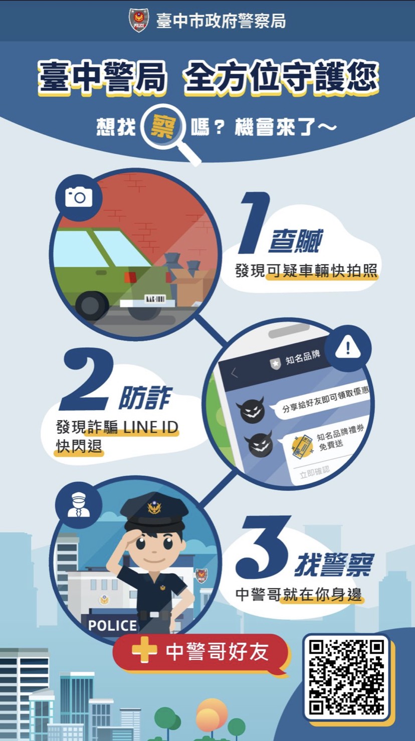 警察局指出,新開發「@TCPB」LINE官方帳號,整合現有多項服務外,後端則整合「AI智慧分析」功能,使用者只要加「@TCPB」為好友,就可以享受多項便捷服務。
