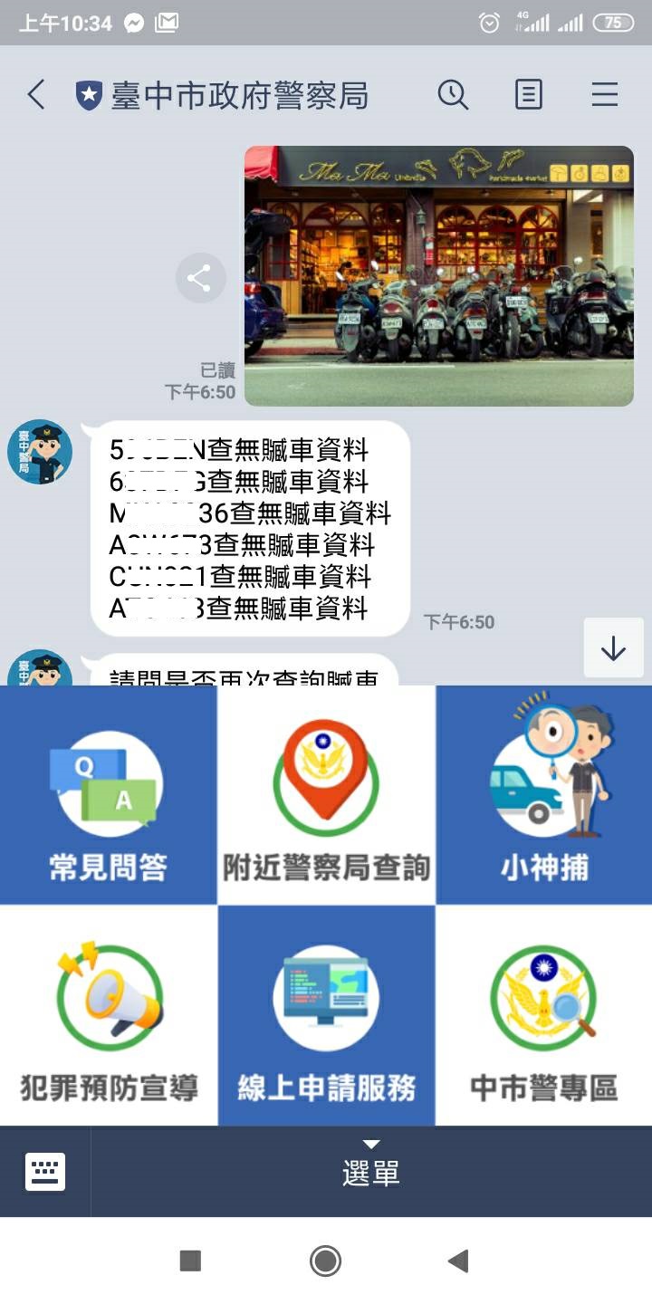 警察局說明,以「查贓車」功能來說,只要進入「@TCPB」,點選「小神捕」,並選擇「手動輸入車號」或「拍攝車牌照片」。只要上傳一張照片,系統AI就能自動比對照片中的所有車牌號碼,並將比對結果一次顯示,立即知道照片中的車號是否為贜車。