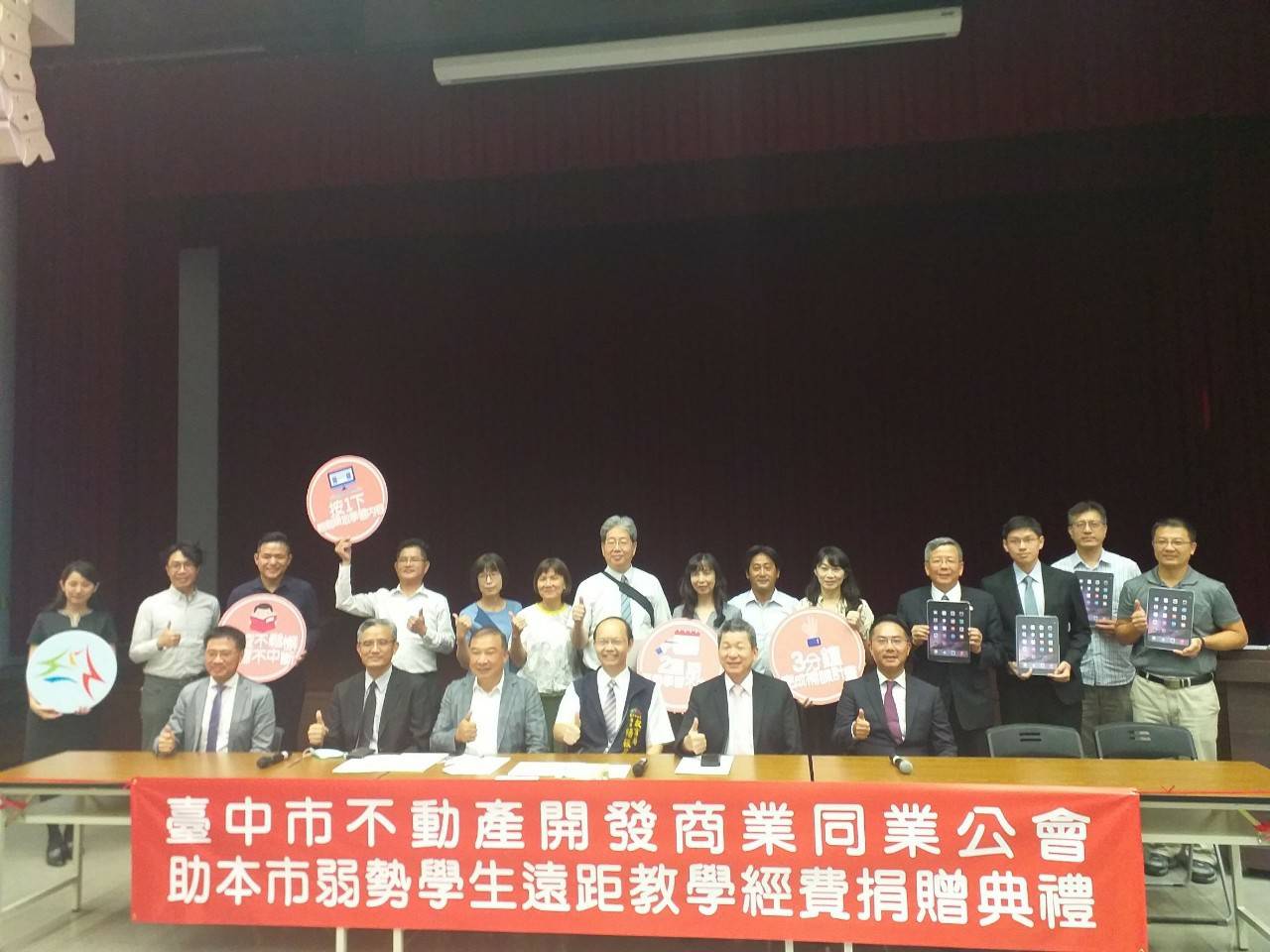 教育局說明,為確保學生在無法到校期間充分利用科技設備,使課業不中斷,在全面調查全市各級學校後,屬低收入戶且家中無平板之學生數約2,800餘位;台中市不動產開發商業同業公會在得知消息後,立即與公會內企業聯繫,在企業共襄盛舉下,共捐贈129萬元至教育局專戶,協助台中市弱勢學生能透過遠距教學,讓學習不中斷。(6/15*15)*教育局