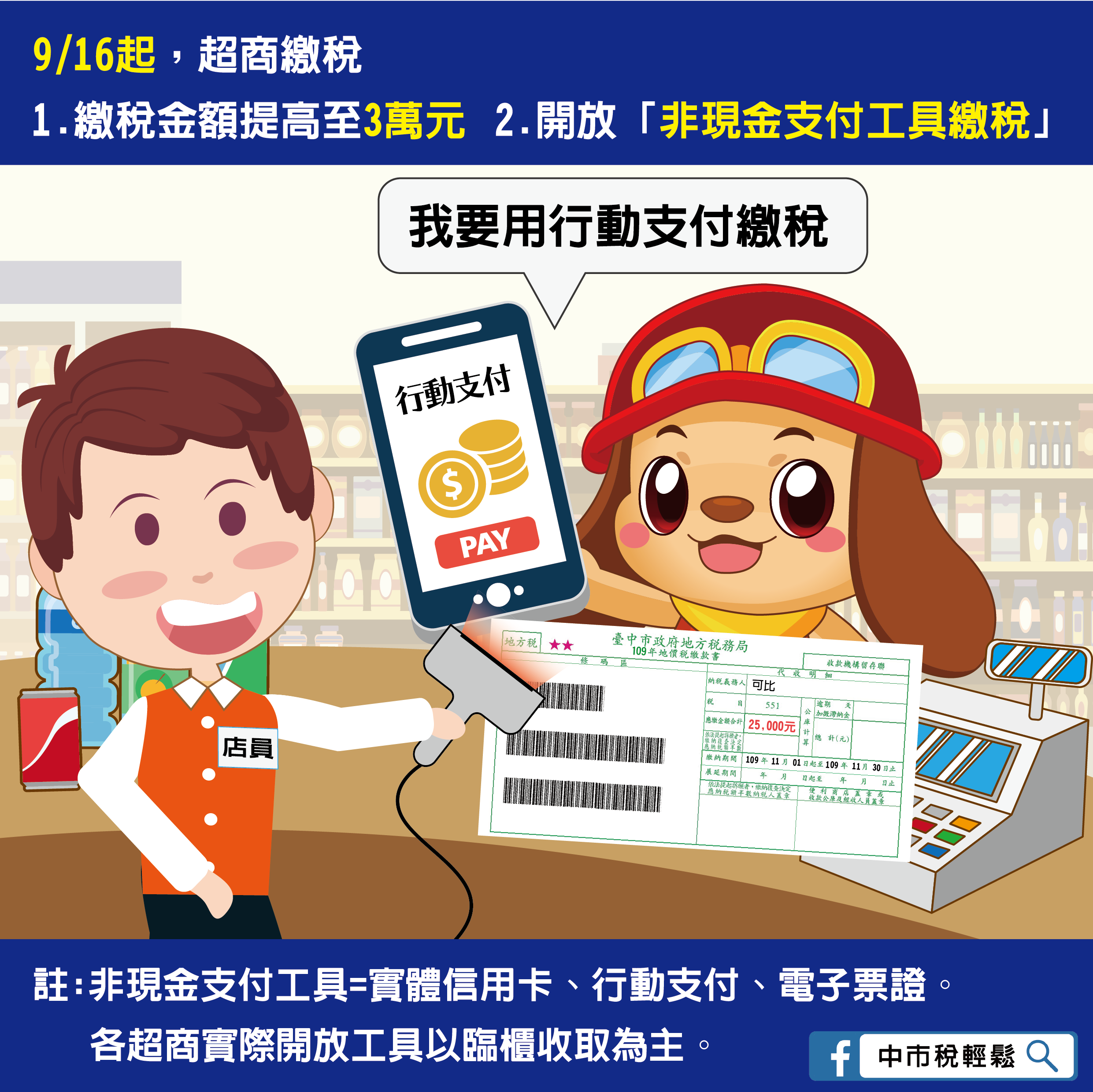 行政院財政部宣布今(16)起全國四大超商代收稅款,限額從2萬元提高到3萬元,開放「實體信用卡」、「行動支付」及「電子票證」等非現金支付工具,讓民眾繳稅快速又方便。台中市政府地方稅務局表示,市府因應疫情推出稅務紓困措施,延期或分期繳稅期限於9月16日後也適用限額3萬元新制,提醒民眾按時繳納。
