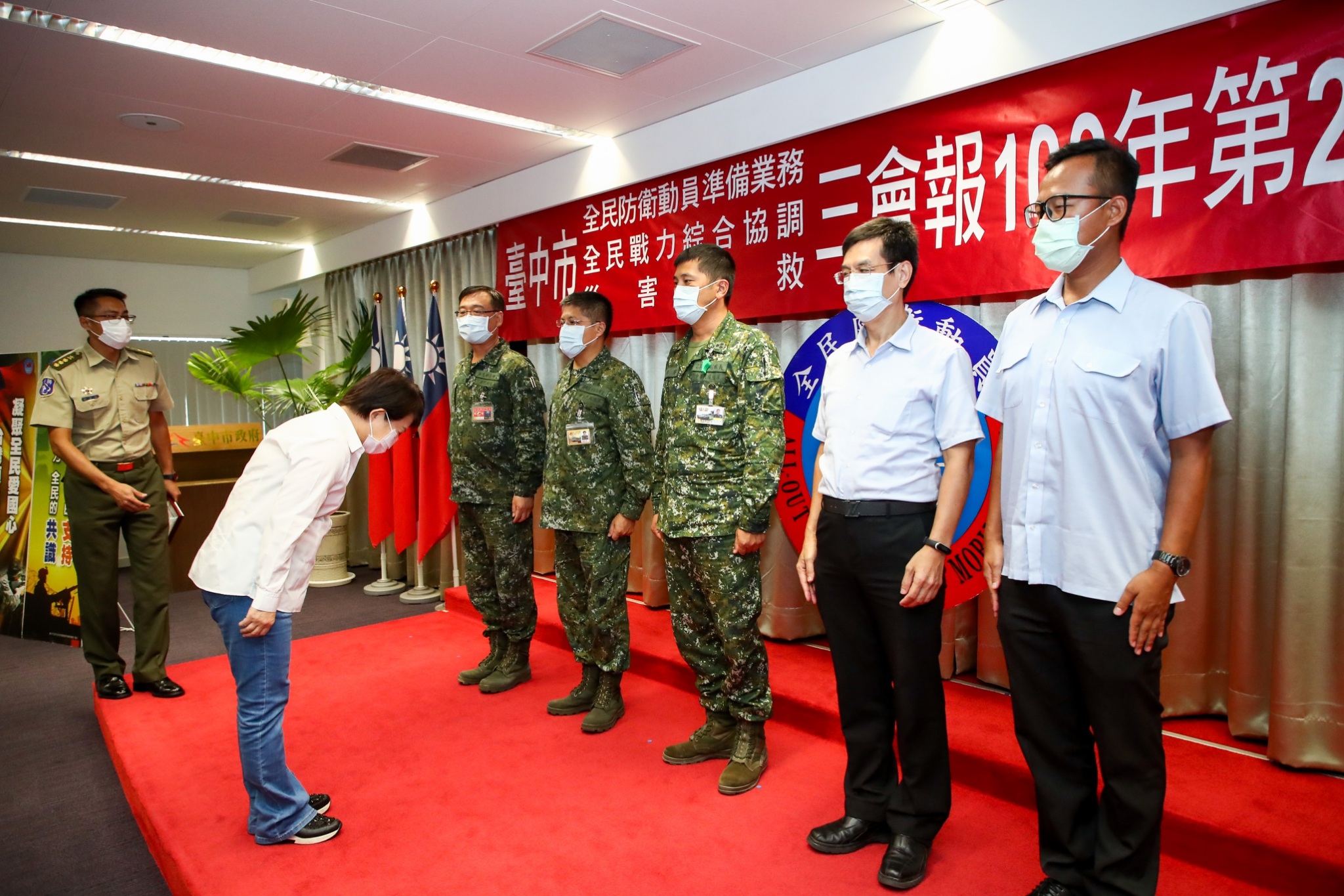 台中市政府今(18)日舉行「109年全民防衛動員準備、戰力綜合協調及災害防救三會報第2次定期會報」,除頒獎感謝國軍、警消、公民營單位在防疫、救災及動員準備工作上辛勤付出,也演練既有民防、緊急醫療、災防等應變機制;市長盧秀燕表示,台中防疫獲中央考評全國第一,防疫有賴平時各種應變演練、全體動員、市民防災意識,三方面多管齊下守護市民安全。