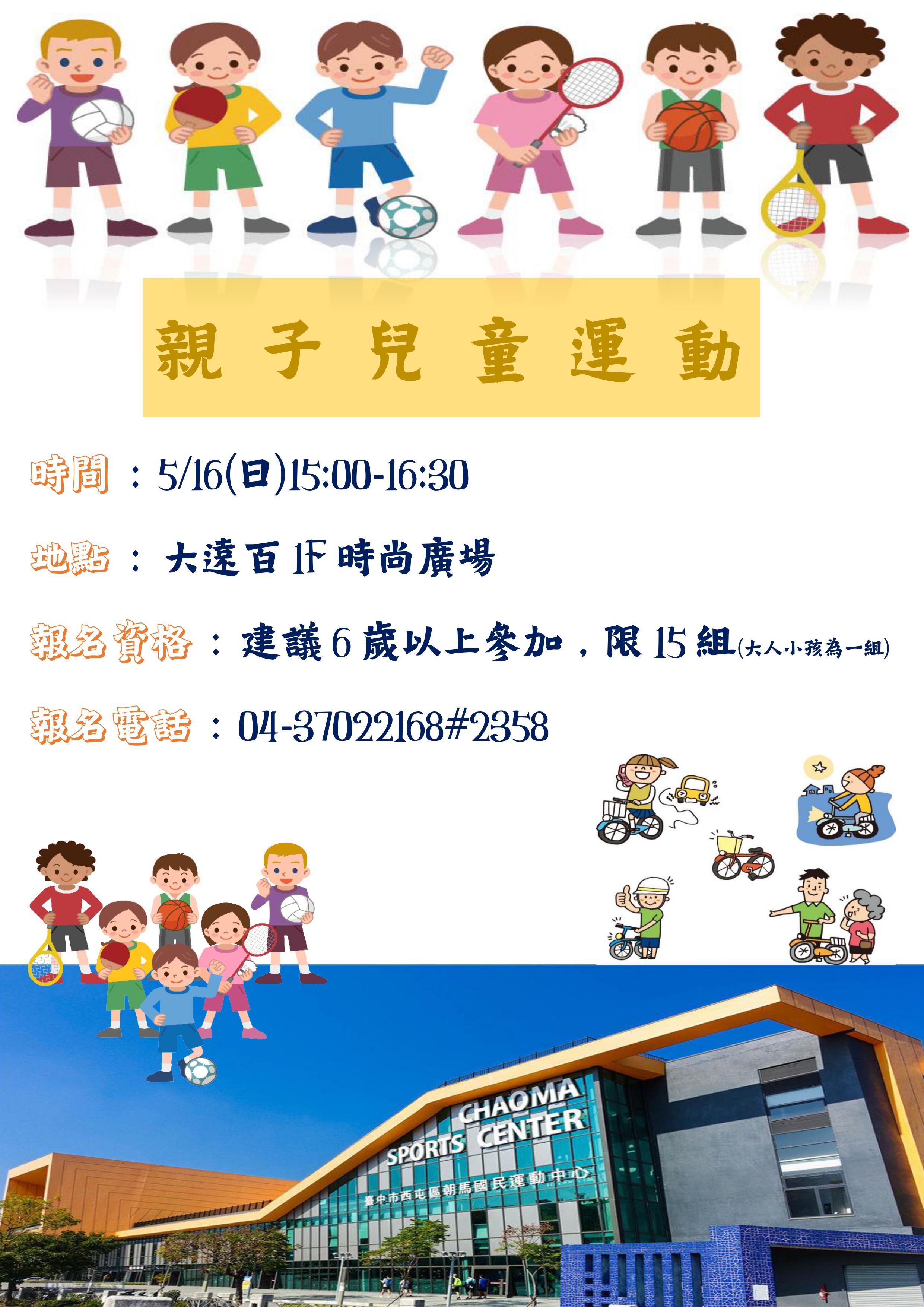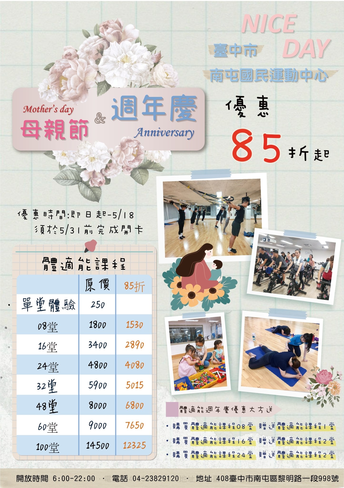 運動局說明,朝馬國民運動中心預計於5月16日下午3時在台中大遠百1樓時尚廣場,舉辦母親節親子運動闖關活動,由該中心專業教練提供指導,藉此促進親子互動默契與情感聯繫;北區國民運動中心在母親節當月推出享溫馨購課優惠方案,包括體適能私人課程「買10送1」及課務組課程單月課程9折優惠;南屯國民運動中心結合母親節及週年慶,規劃課程優惠85折起,凡在5月18日前報名體適能、健身、球類等課程可享有優惠價格。