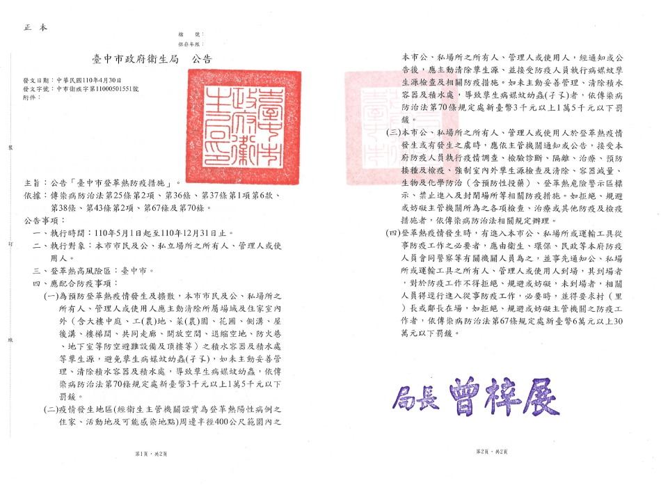 曾局長提醒,台中市登革熱防疫措施已公告,呼籲民眾使用中的儲水容器務必刷洗並加蓋或加掛細網,並配合清除室內、外積水容器,落實「巡、倒、清、刷」,如未主動清除導致孳生病媒蚊幼蟲,將依《傳染病防治法》開罰3千元到1萬5千元罰鍰。(5/3*18)*衛生局