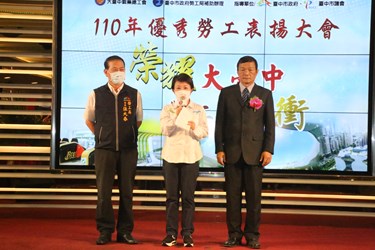 表達對勞工們的感恩之心,大台中職業總工會昨(23)日於東達極品美饌舉行「110年度優秀勞工表揚大會」,特別選在五一勞動節前夕,盛大表揚所屬基層工會302位優秀勞工及10位優秀會務人員。市長盧秀燕出席頒獎,逐一鞠躬致敬,感謝各工會的認真付出及優秀理監事團隊合作無間,讓工會能健全運作會務、為勞工福利不斷努力。