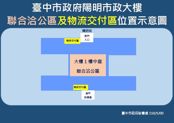 市府秘書處表示,雖然COVID-19警戒標準及因應事項第二級規定,原則只限室內100人以上的會議及活動,但市府防疫加嚴加密,明日起將重啟聯合洽公區,各機關將派員至1樓洽公區受理民眾申辦文件或諮詢;此外,進入市政大樓的訪客與洽公人員皆須全程配戴口罩與實聯登記,物流人員也需統一至1樓「物流交付區」交貨;而台灣大道市政大樓自明日起,也將全面暫停導覽服務。