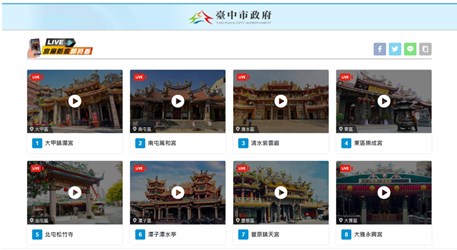 民政局說明,「宮廟防疫即時看」彙整中市大甲鎮瀾宫、大雅永興宫、北屯三官堂、北屯松竹寺、西屯惠來里福德祠、西屯福壽宮、東區樂成宮、南屯萬和宮、清水紫雲巖、潭子潭水亭、豐原鎮天宫、東區南天宮及靜宜大學主聖母堂等13間宗教場所合作,民眾只要至民政局網站專區( http://taichung-civil.csii.com.tw  ),即可觀看宗教場所即時影像,避開參拜人潮,降低感染風險。(5/14*8)*民政局