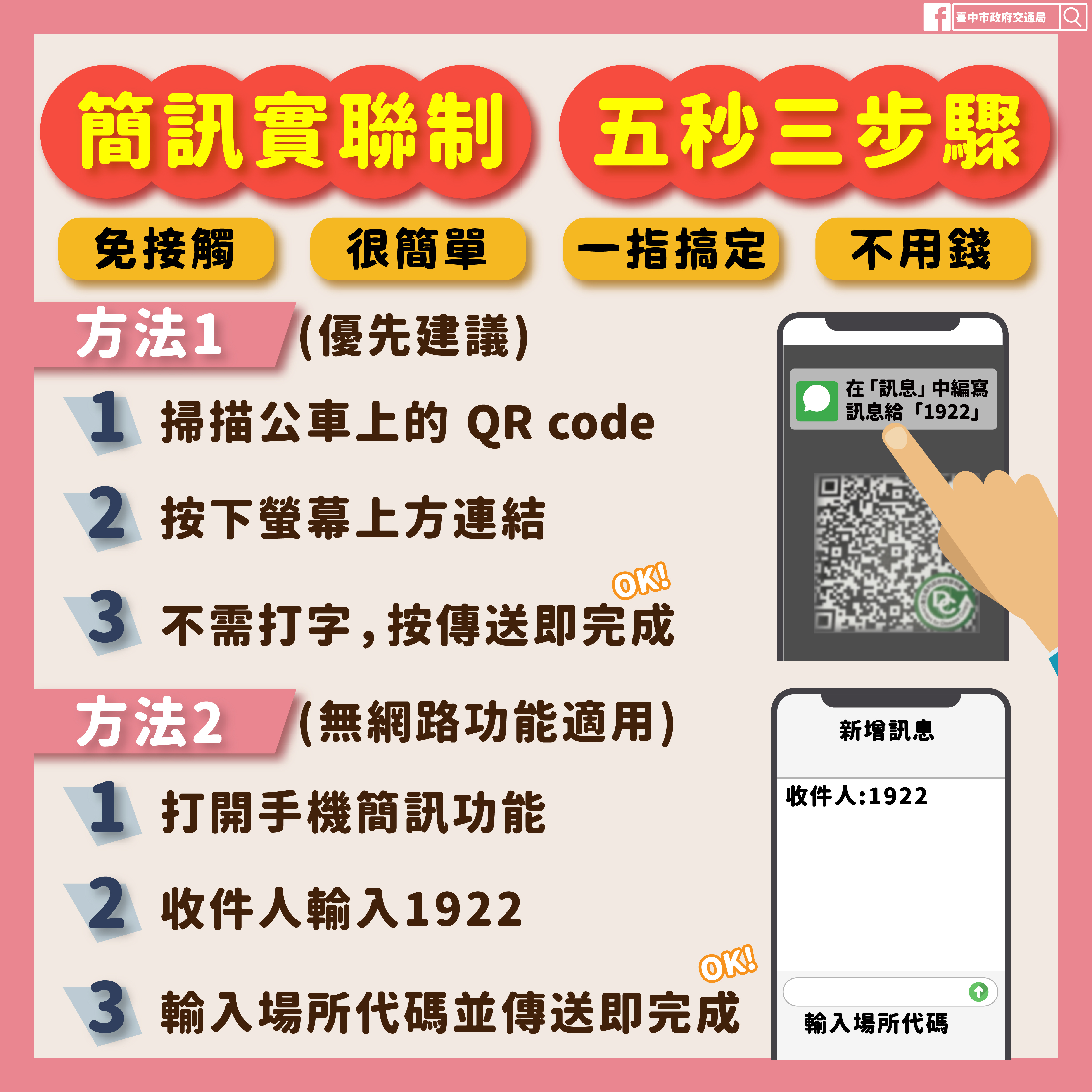 交通局長葉昭甫表示,配合全國實施三級警戒,中市公車全面落實實聯制及公車班次調降15%,並在車上放置酒精供民眾使用。民眾操作實聯制「簡訊完全免費、不用加入會員、不用特殊設備、民眾不留個資、陽春手機也可使用」,除簡訊實聯制外,也可透過Line「疾管家」帳號,按下連結、傳送簡訊給1922,即可完成。另外,針對沒有照相功能的手機,民眾只要打開簡訊功能,在收件人輸入1922,訊息欄位輸入代碼再發送簡訊也可以。