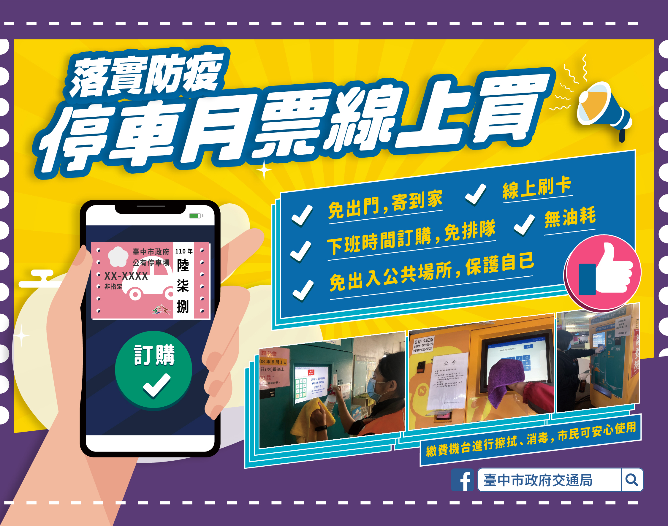 因應新冠肺炎疫情警戒提升至三級,台中市政府交通局持續落實公有停車場防疫措施,除每日清潔、消毒停車場域及設備,為兼顧防疫與工作人員飲食需求,特別設置防疫期間停車場用餐區,延長停管員用餐休息時間;另為擴大防疫工作,交通局已於5月20日起張貼簡訊實聯制QR code供民眾掃碼登記,積極推動線上購買月票等措施,共同為防疫努力。