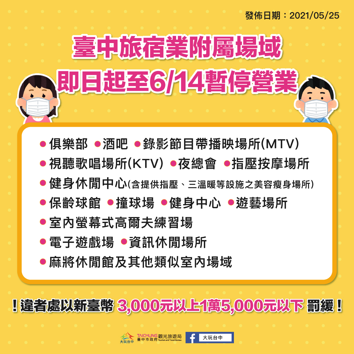 觀旅局指出,為避免造成防疫破口,已請草悟廣場富地市集營運廠商配合延長暫停營業至6月14日,台中旅宿業附屬場域也將同步暫停營業,包括俱樂部、酒吧、錄影節目帶播映場所(MTV)、視聽歌唱場所(KTV)、夜總會、指壓按摩場所、健身休閒中心(含提供指壓、三溫暖等設施之美容瘦身場所)、保齡球館、撞球場、健身中心、室內螢幕式高爾夫練習場、遊藝場所、電子遊戲場、資訊休閒場所、麻將休閒館及其他類似室內場域),也請民眾配合確保安全,共同為防疫盡一份心力。