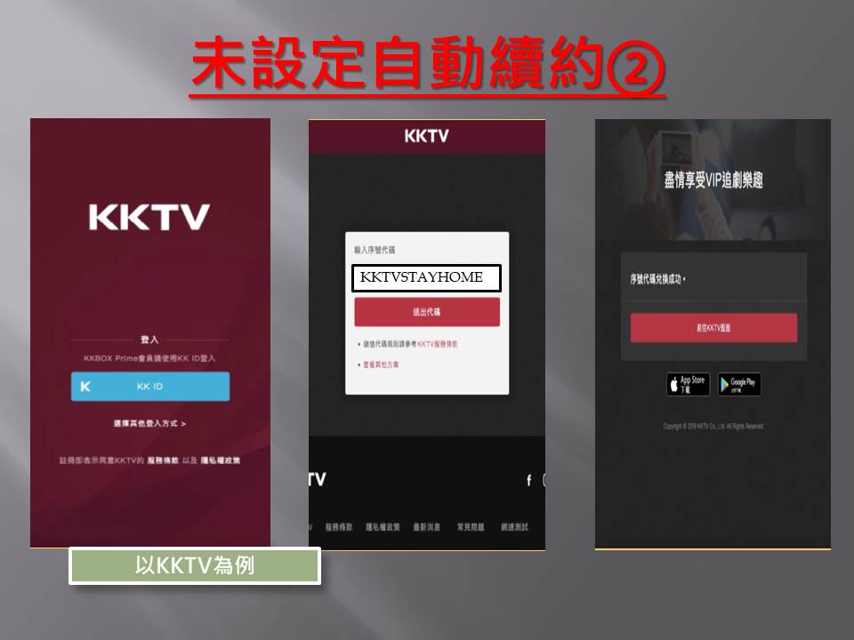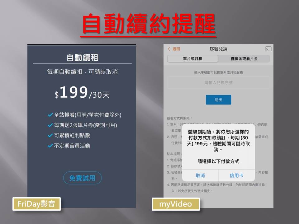 台中市政府法制局李善植局長表示,疫情期間,影音串流業者提供的免費序號,對消費者居家更舒適,固然是好事,但實際測試業者的優費措施發現,KKTV、愛奇藝、LINE TV提供的免費服務,不會在系統預設自動續閱,民眾在試用期滿後,如想續訂,需至其APP系統再行設定訂閱及選擇費率;而friDay影音雖亦有免費試用,惟因為提供「自動續租」的免費試用,以及myVideo於兌換序號時,系統會跳出視窗提醒體驗到期後自動扣款續訂。李局長說,friDay影音及myVideo這2個平台雖提供免費體驗但因係搭配系統預設自動續約,故消費者如未於免費試用期滿前主動取消訂閱,則試用期過後每個月不論有無使用服務,都需依約繳納影音串流服務費用。這些免費服務之後是否會跟著續訂服務,業者都在消費者訂閱APP時均有清楚說明,消費者訂閱時務必詳細閱讀說明條款,倘不想續訂也要依訂閱時之說明,記得及時取消訂閱,才不會荷包受損。