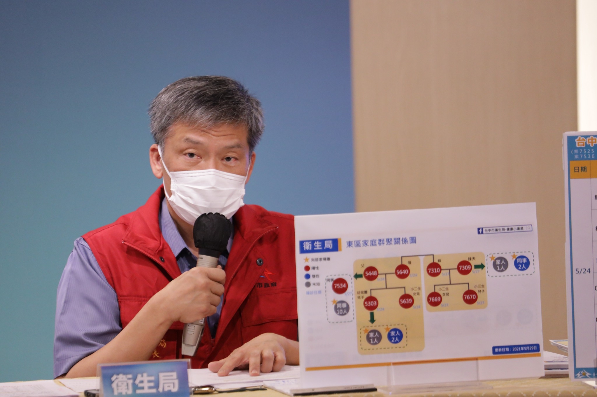 衛生局長曾梓展針對今日確診案例一一說明,潭子立揚鞋業家庭群聚感染今日新增10例,均為5月27日公布的案6541(立揚鞋業負責人的女兒、立揚鞋業包裝員)的家庭成員及親友,包含她的奶奶、父親、母親、姊姊、姊姊男友、男友媽媽、大伯父、大伯母、堂弟及二伯母,累計11例,因屬自家家族企業,家人同住,感染者均為家庭親友成員,傳播鏈明確。