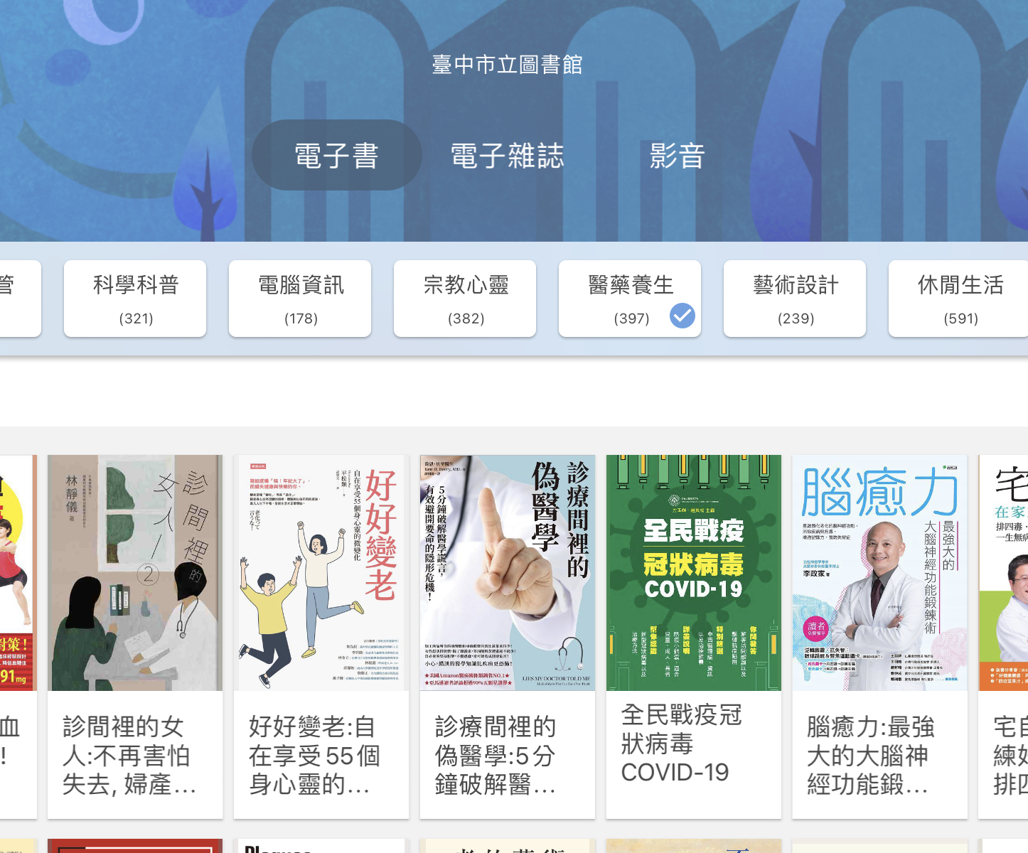 台中市立圖書館長張曉玲表示,電子書庫中有許多書籍,並依照年齡層分類的閱讀認證書櫃,像是繪本、有聲書和文學小說,讓家長不再傷腦筋,孩子宅在家也能讀好書;針對樂齡族群則提供養生食譜、身體保健、手工技藝和語言學習等多元主題電子書。