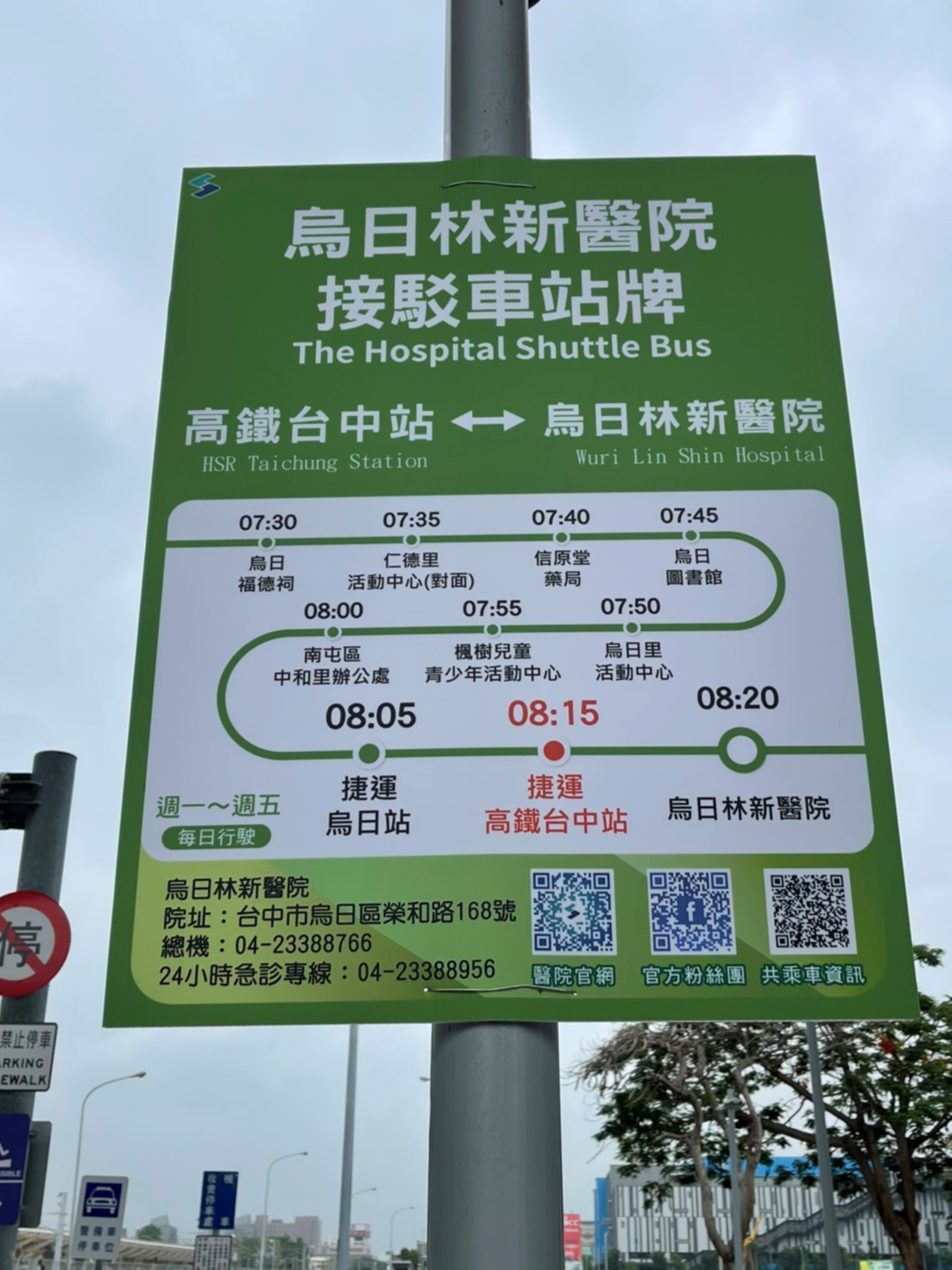 烏日林新醫院免費共乘車「烏日線」6月1日起在捷運烏日站2號出口、捷運高鐵臺中站2號出口增設停靠站,週一至週五行駛,每天上午去程及回程各1班次,去程上午8:05捷運烏日站,8:15分高鐵臺中站;回程時間可以詢問醫院。另因松竹站為捷運與台鐵轉乘站,慈濟醫院捷運接駁車站點設置於台鐵松竹站出口3,週一至週六發車,目前為30分鐘1班。