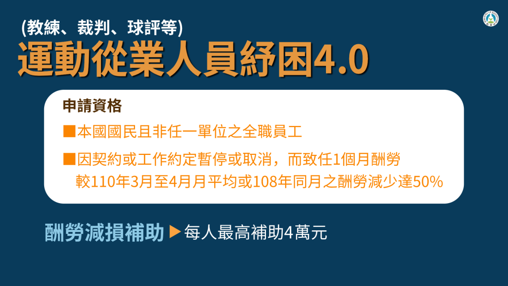 國內疫情爆發衝擊經濟,為加速紓困,教育部針對受影響而有營運困難的運動事業及相關從業人員,推出「運動紓困4.0」措施,補貼包括室(外)運動場館經營管理行業如球類運動場館、室內(外)游泳池、拳擊館、田徑場、健身中心及賽車場等運動事業,及符合資格的運動從業人員每人最高補助4萬元,自6月7日起至8月31日止線上受理申請。