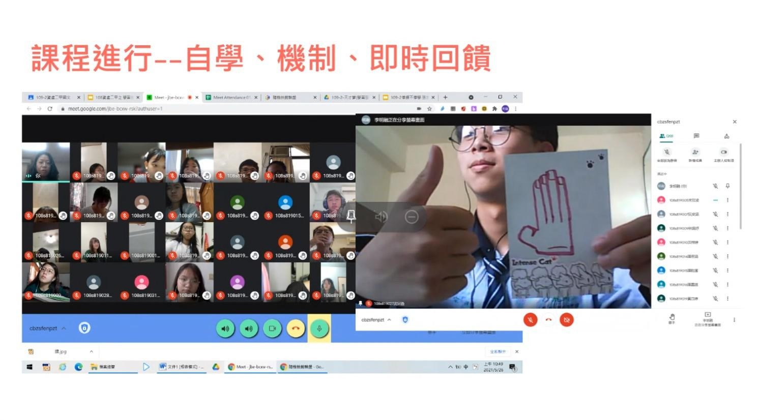 此外,李明融老師會在課前要求學生建立良好的上課秩序與態度,讓學生具有「儀式感」,並運用Google行事曆開設多個會議室,讓學生進行小組討論,提升「參與感」。學生報告後,其他同學須透過螢幕高舉自製牌卡給予回饋,讓班級即使面對電腦學習,也能感受人與人互動的溫度。