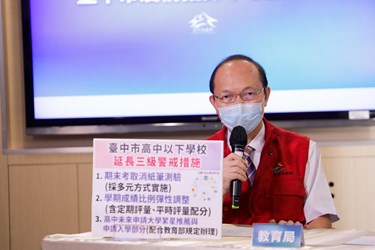 教育局長楊振昇說明,台中市公私立高中職以下學校期末考部分,已建議學校取消紙筆測驗,以繳交作業、口頭報告、作品製作、線上作業或即時問答等多元方式實施,採從寬認定為原則;學期成績則授權學校彈性調整定期評量與平時評量的配分比例;高中學期成績部分,因與高中生未來申請大學繁星推薦、大學入學相關,學習成績將配合教育部相關規定辦理,希望各校在同年級、同科目的評量具有一致性,維持升學公平性。