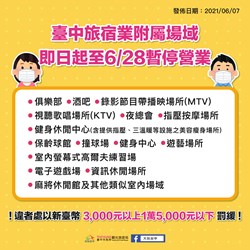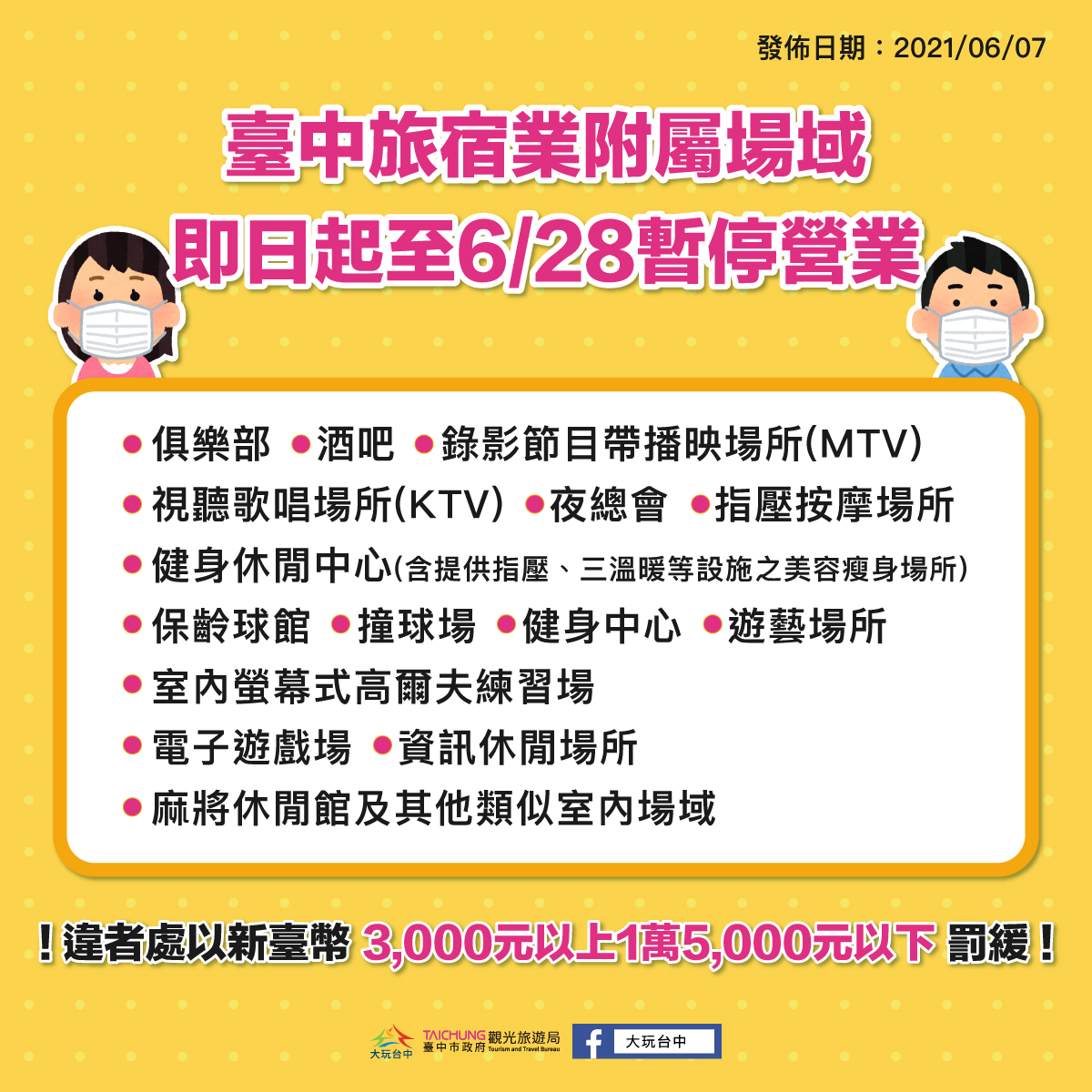 觀旅局說明,為避免造成防疫破口,草悟廣場富地市集營運廠商持續配合延長暫停營業至628日,台中旅宿業附屬場域也持續暫停營業,包括俱樂部、酒吧、錄影節目帶播映場所(MTV)、視聽歌唱場所(KTV)、夜總會、指壓按摩場所、健身休閒中心(含提供指壓、三溫暖等設施之美容瘦身場所)、保齡球館、撞球場、健身中心、室內螢幕式高爾夫練習場、遊藝場所、電子遊戲場、資訊休閒場所、麻將休閒館及其他類似室內場域),請民眾配合暫緩涉足,以確保自身及他人安全,共同為防疫盡一份心力。
