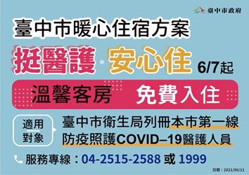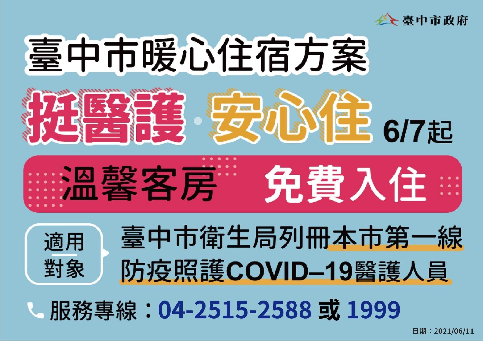 新型冠狀病毒疫情嚴峻,為體恤前線醫護人員辛勞,台中市政府結合各界資源推出「醫護暖心住宿」方案,針對衛生局列冊的第一線COVID-19病患照護醫事人員,自67日起提供免費住宿,目前已預約登記共162夜次。市長盧秀燕今(11)日表示,歡迎符合資格的醫護入住休息,養精蓄銳專心抗疫;此外,市府也全力支援苗栗,已後送77名篩檢陰性的民眾到台中居家隔離,共同抗疫不遺餘力。