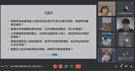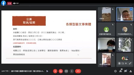 文化局表示,線上說明會邀請國立中山大學陳志維講師說明文化部目前藝文紓困4.0的申請類別及流程,視覺設計師鄭秀芳和文訊雜誌社主任詹宇霈則分別建議申請紓困時盡量以條列式、量化表格說明受影響的情況和損失。為即時解答藝文工作者提出的問題,包括申請資格和準備佐證資料等,說明會同時邀請文化部藝術發展司、人文及出版司科長線上回應參與者的提問,台中市議員王立任也全程參與。