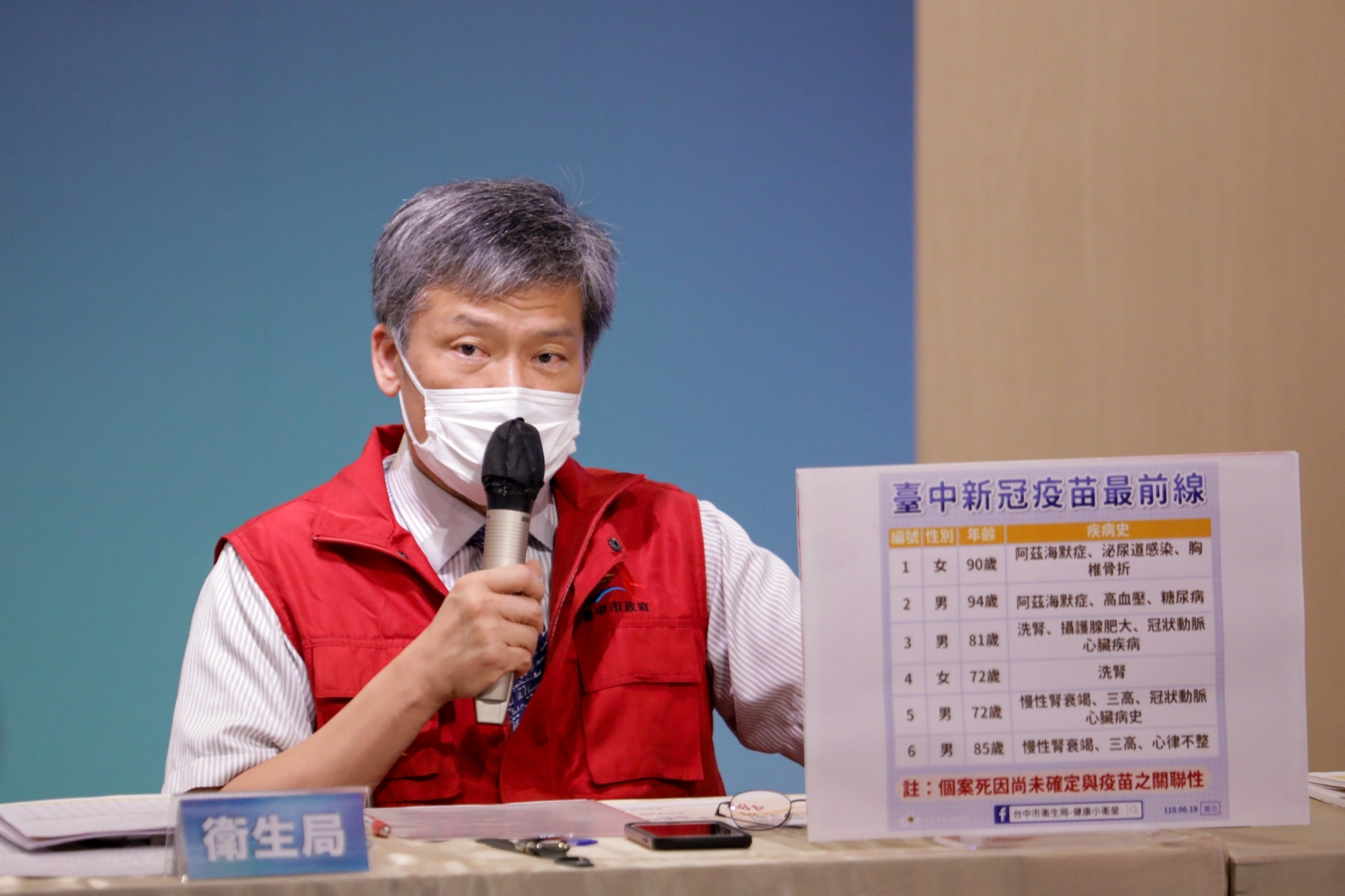 全台自6月15日起,開放85歲以上長輩接種AZ疫苗,各地陸續出現長輩接種後不適情形,截至今(18)日中午為止,台中市共有6名長者過世案例。衛生局長曾梓展表示,6名長輩於死亡之前均曾注射疫苗,目前中央尚未釐清接種AZ疫苗與死亡間的關聯性,盼中央能儘速說明,讓民眾早日安心。