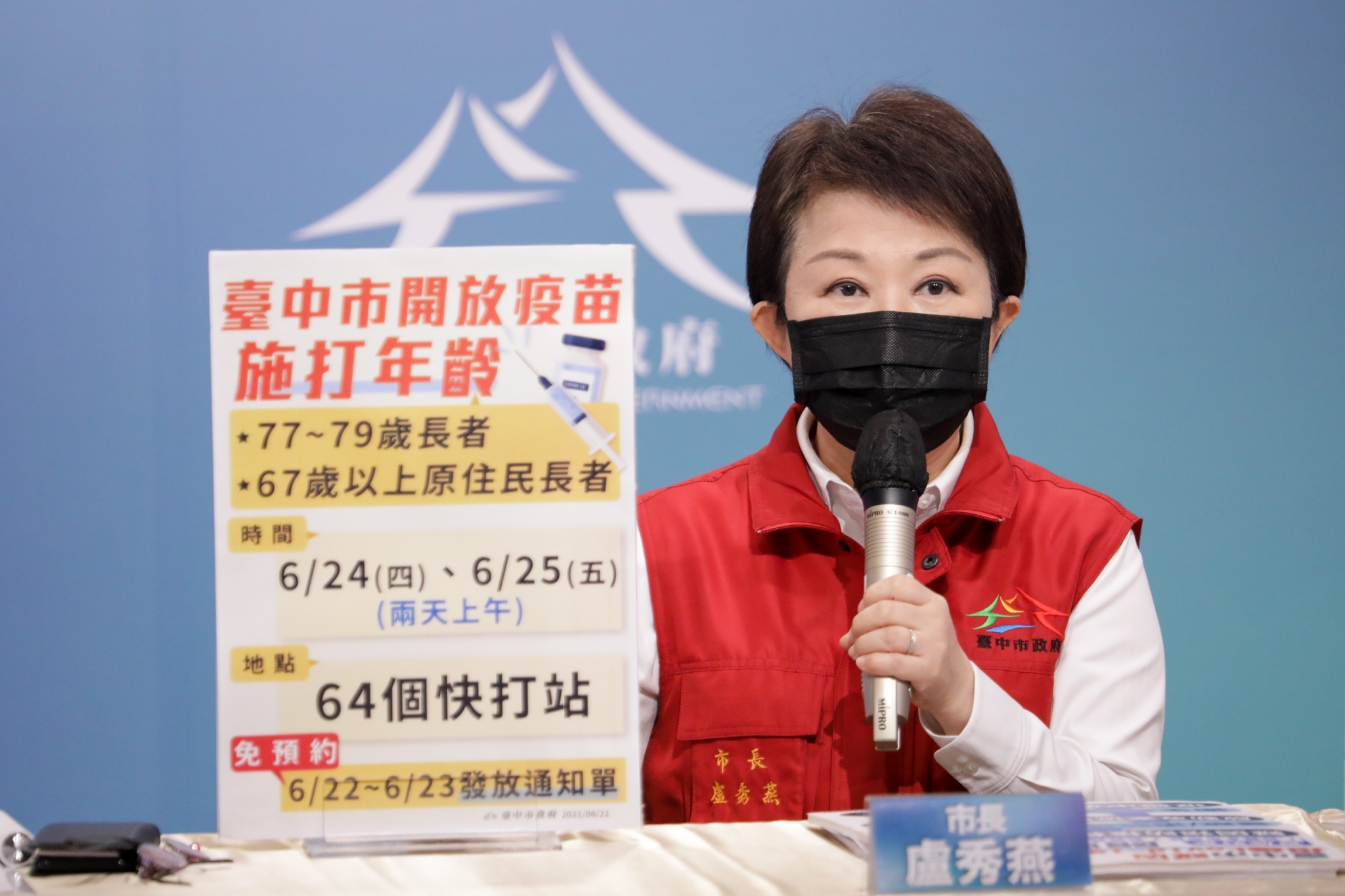 台中市政府今日下午召開台中市疫情指揮中心線上記者會,盧市長表示,上週末開放80至84歲長輩、鄰長施打疫苗,共施打2萬8,809人,目前台中市疫苗還剩2萬多劑,一部分作為本週臥床失能7至8級的長輩到府施打,另一部分作為醫療院所供1至5類及第二劑預約施打,為讓珍貴的疫苗妥善使用,本週將開放台中市77歲以上長輩及67歲以上原住民長輩接種。