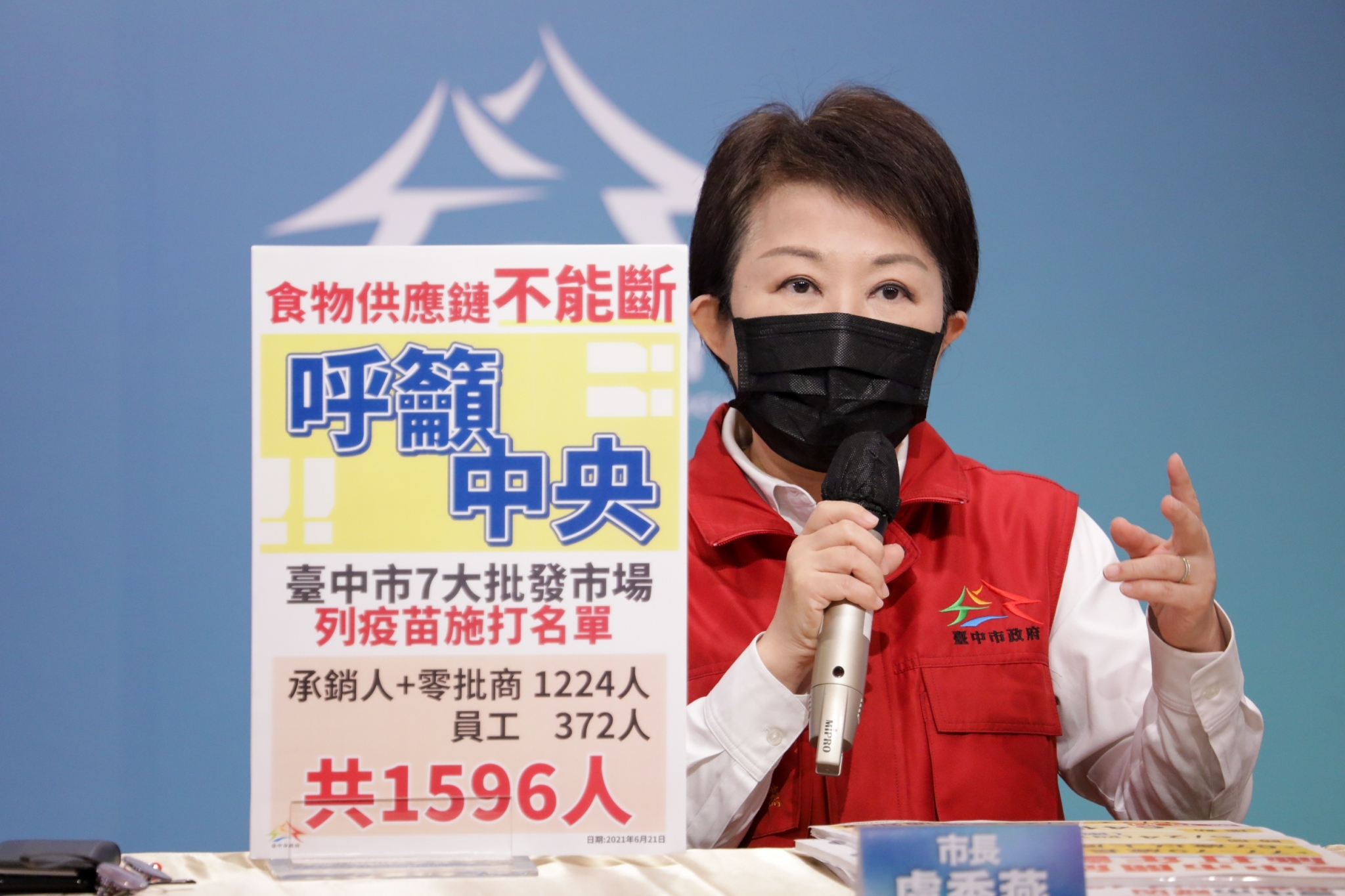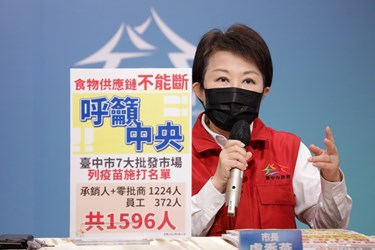 市府說明,批發市場一旦出現問題將使食物供應鏈中斷,恐衝擊民生,因此,批發市場員工也應列為施打優先對象,目前台中市有7處批發市場,包含台中果菜、豐原果菜、東勢果菜、台中肉品、大安肉品、台中魚市及台中花卉,員工372人,承銷人與零批商共1,224人,總計1,596人。(6/21*15)*衛生局