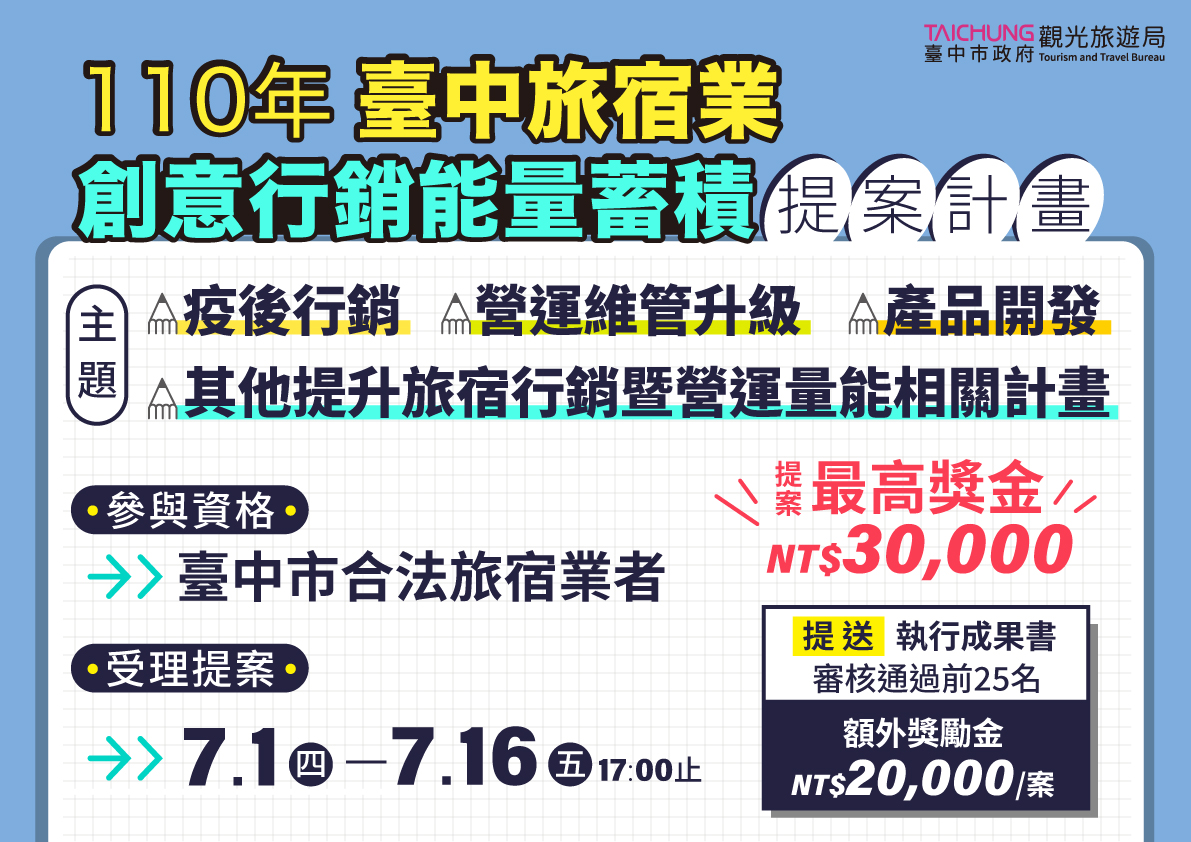 新冠肺炎疫情衝擊觀光產業甚鉅,為鼓勵台中市旅宿業者趁疫情期間盤點資源為疫後振興蓄積量能,觀旅局推出「台中旅宿業創意行銷能量蓄積提案計畫」,並於今(30)日透過大玩台中Facebook粉絲專頁舉辦直播線上說明會,協助業者了解計畫內容及提案申請方式,共同提升觀光產業競爭力。